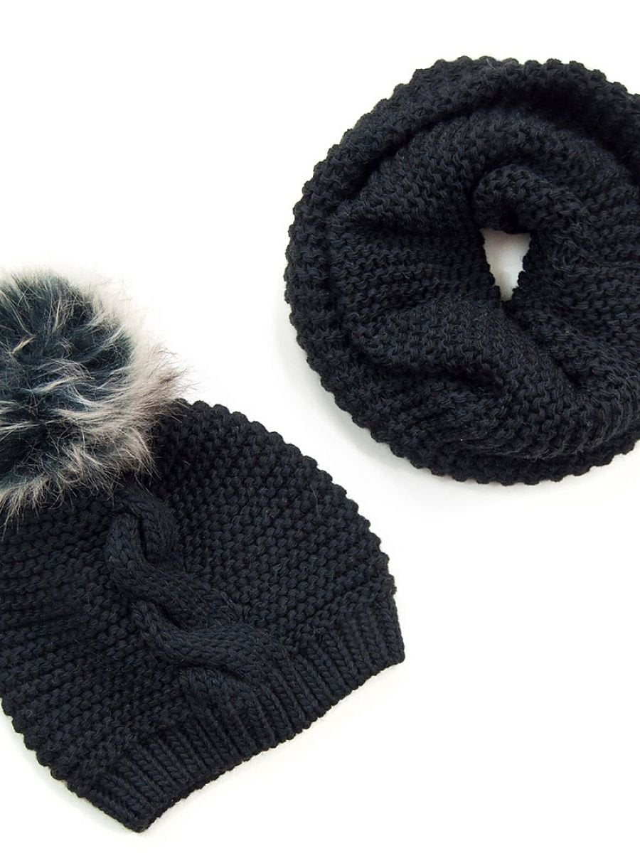Stylish set: hat and tube type chimney. Beanie with a fluffy pom-pom, subtly braided, woolen and warm. On the front there is a single, expressive braid. Looks great when worn. To it at once, perfectly matching chimney, which you can wear worn at once (longer) or in a shorter version, double folded.