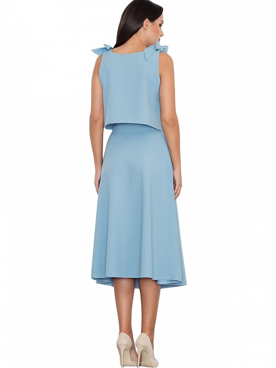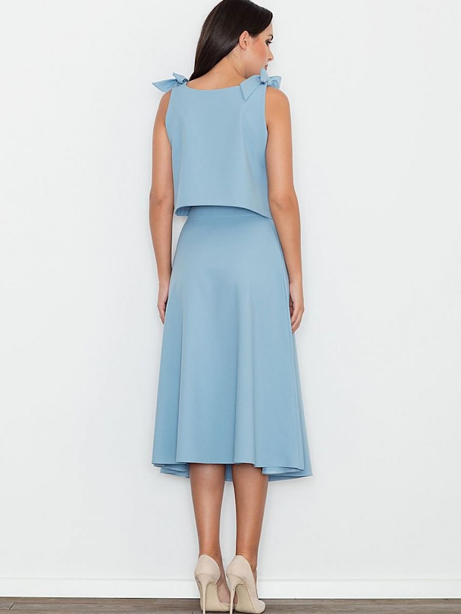 A stylish set with a skirt. Great cut of the skirt adds comfort every day. Straight, flared to mid-calf, with a concealed zip at the back. The top is loose with decorative bows and tied at the shoulders. The whole for those who like to look fashionable and modern.