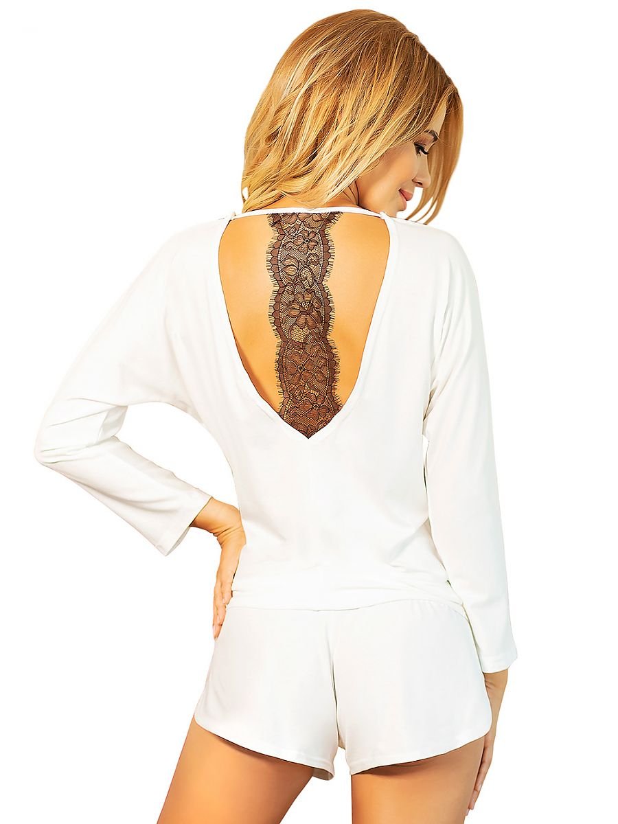 A lovely two-piece viscose set by Chalandri. The top is a long-sleeved blouse with a plain front, while the back was created by combining lace and viscose. The set includes shorts with overlapping leg sides. A comfortable, casual set for everyday wear and for bigger occasions.