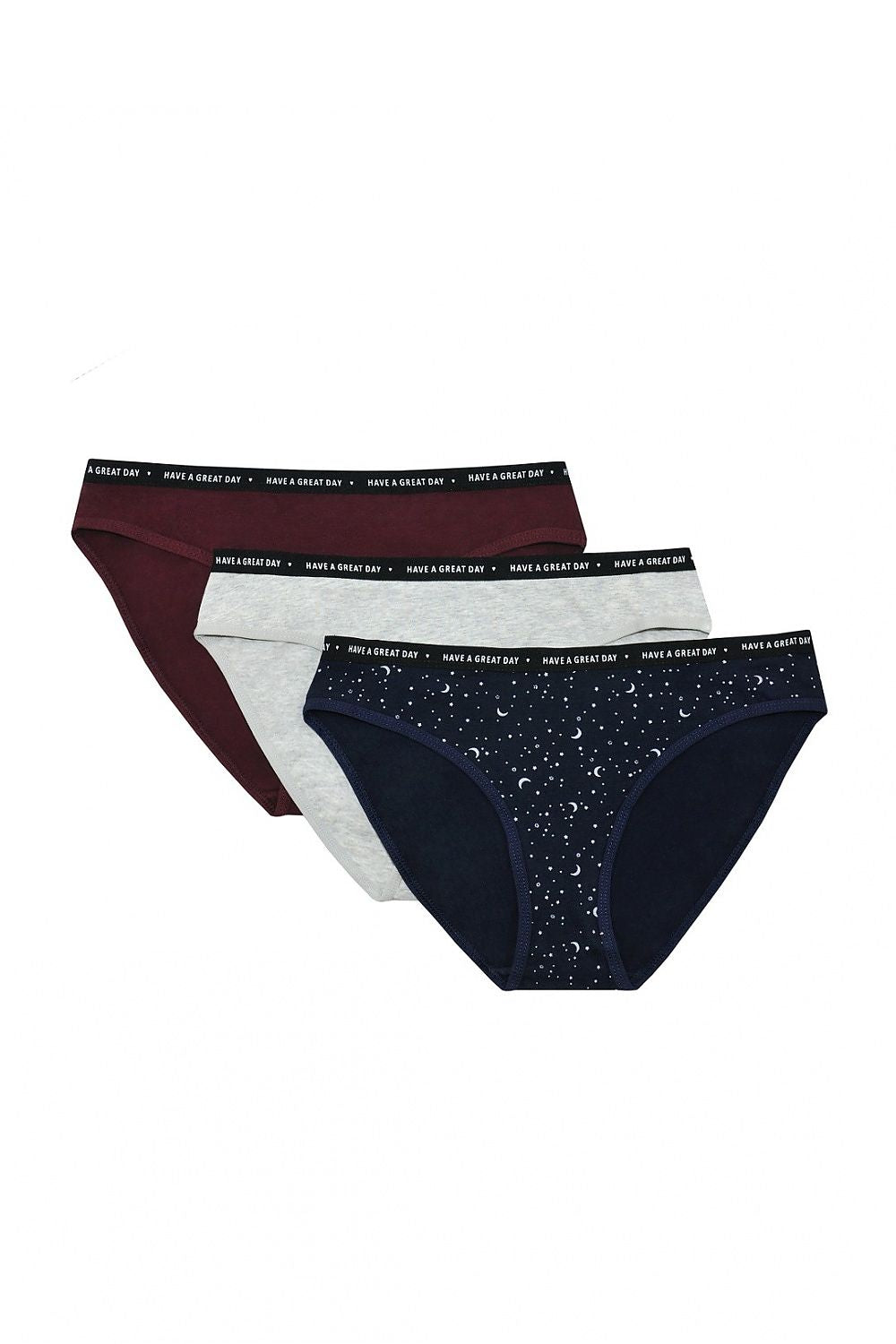 Sensational set of 3 pieces of cotton panties from the new collection Henderson Ladies. The version decorated with 1,5 cm black elastic waistband covered with Have a nice day print. It is a perfect everyday, slightly sporty base, which is so nice to jump into in the morning. The set includes light grey panties, aubergine smooth and navy blue ones covered with a sweet print. Recommended!