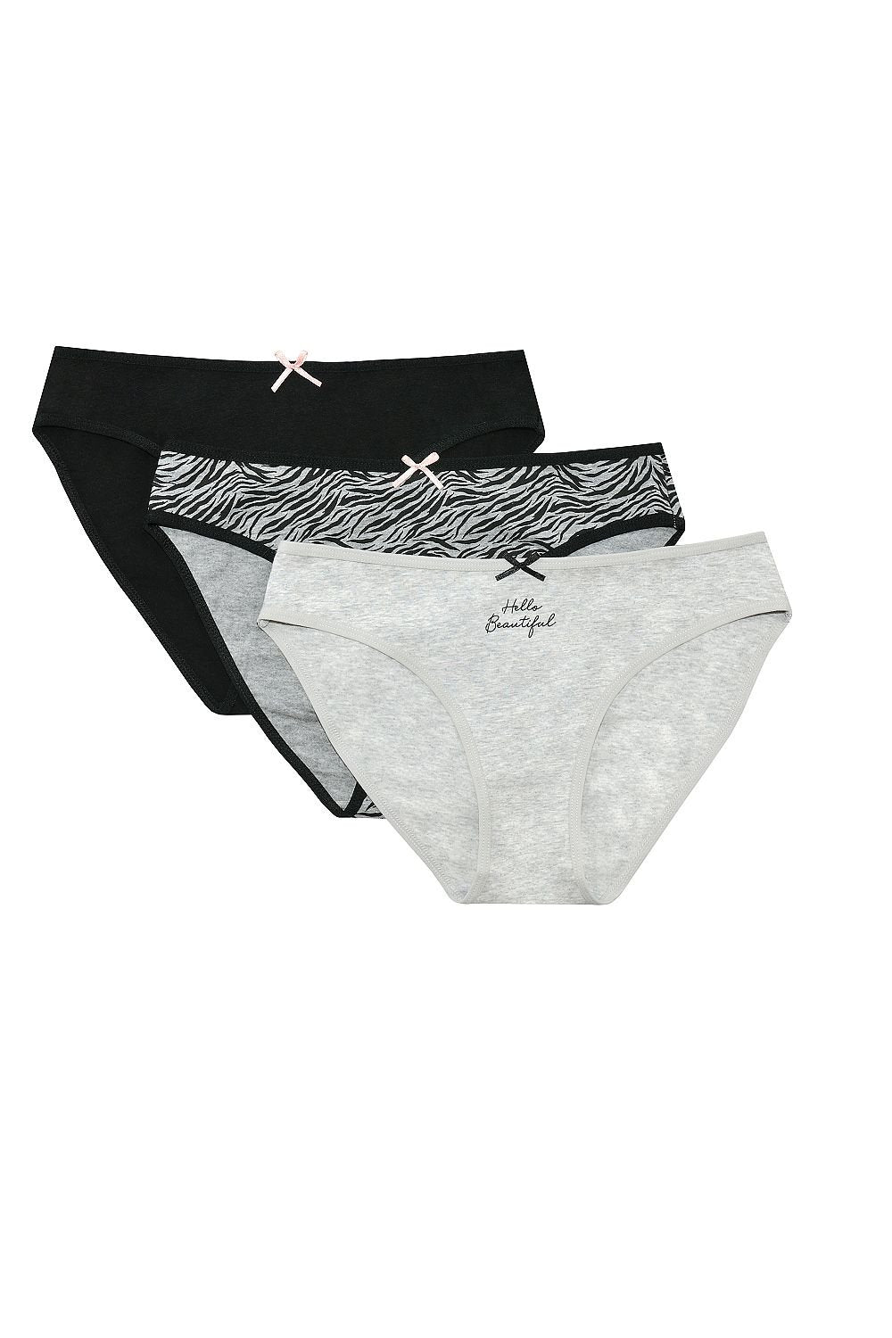 Set of 3 comfortable cotton panties from the new Hednerson Ladies line. The set includes one in this season's fashionable zebra pattern, the second in black and the third in light grey with the inscription Hello Beautiful. Classic, feminine style, rubber in the tunnel, a small bow at the top.