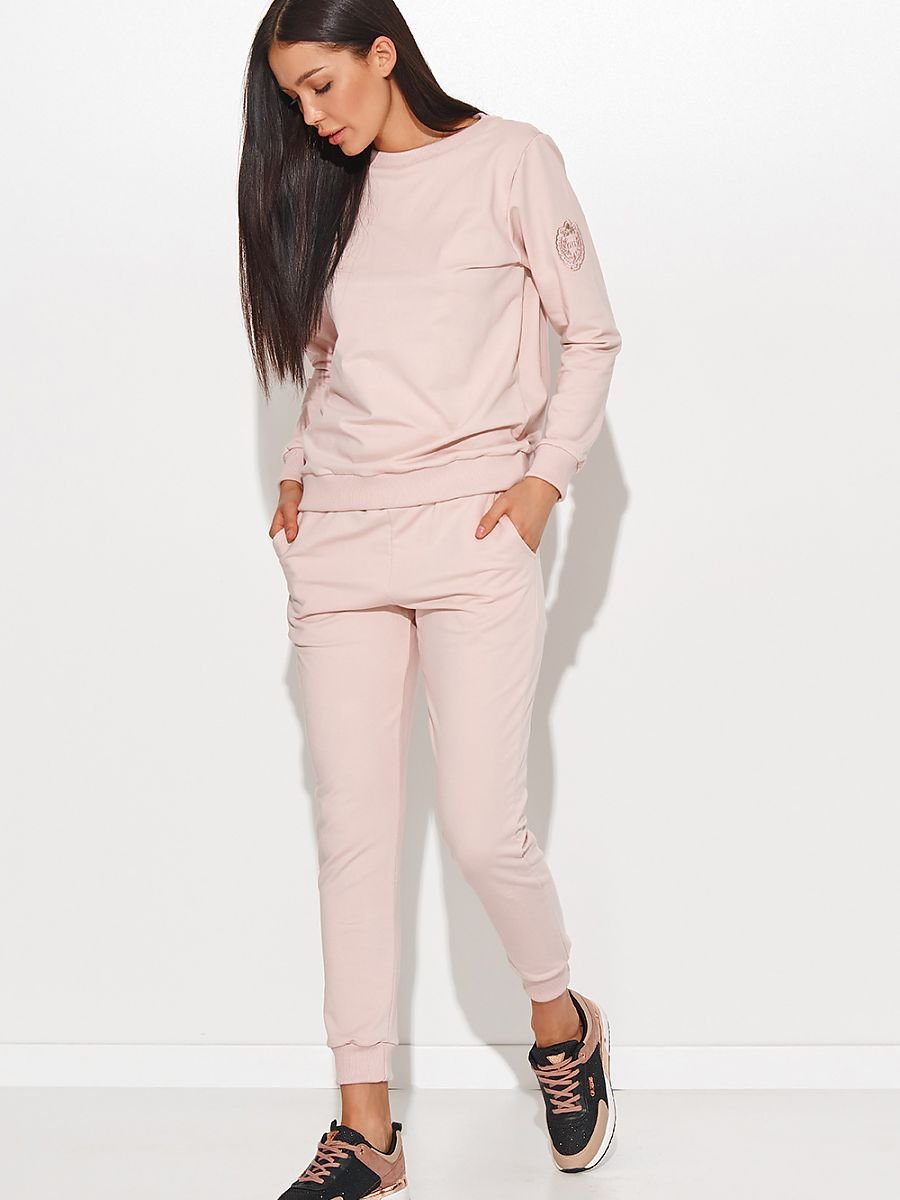 Classic women's set, made of thin cotton knitwear, will be perfect for business and everyday stylizations. The set is uniform and simple. The only decoration is a beautiful, delicate patch with the brand's signature. This makes the set extremely universal. The blouse has a round neckline and the pants have practical side slip pockets. Match it with your favorite high-heeled shoes and an elegant handbag, and go out on the town. Do you prefer casualness to elegance? Then slip on your sports shoes, grab your backpack and wear this beautiful tracksuit set.