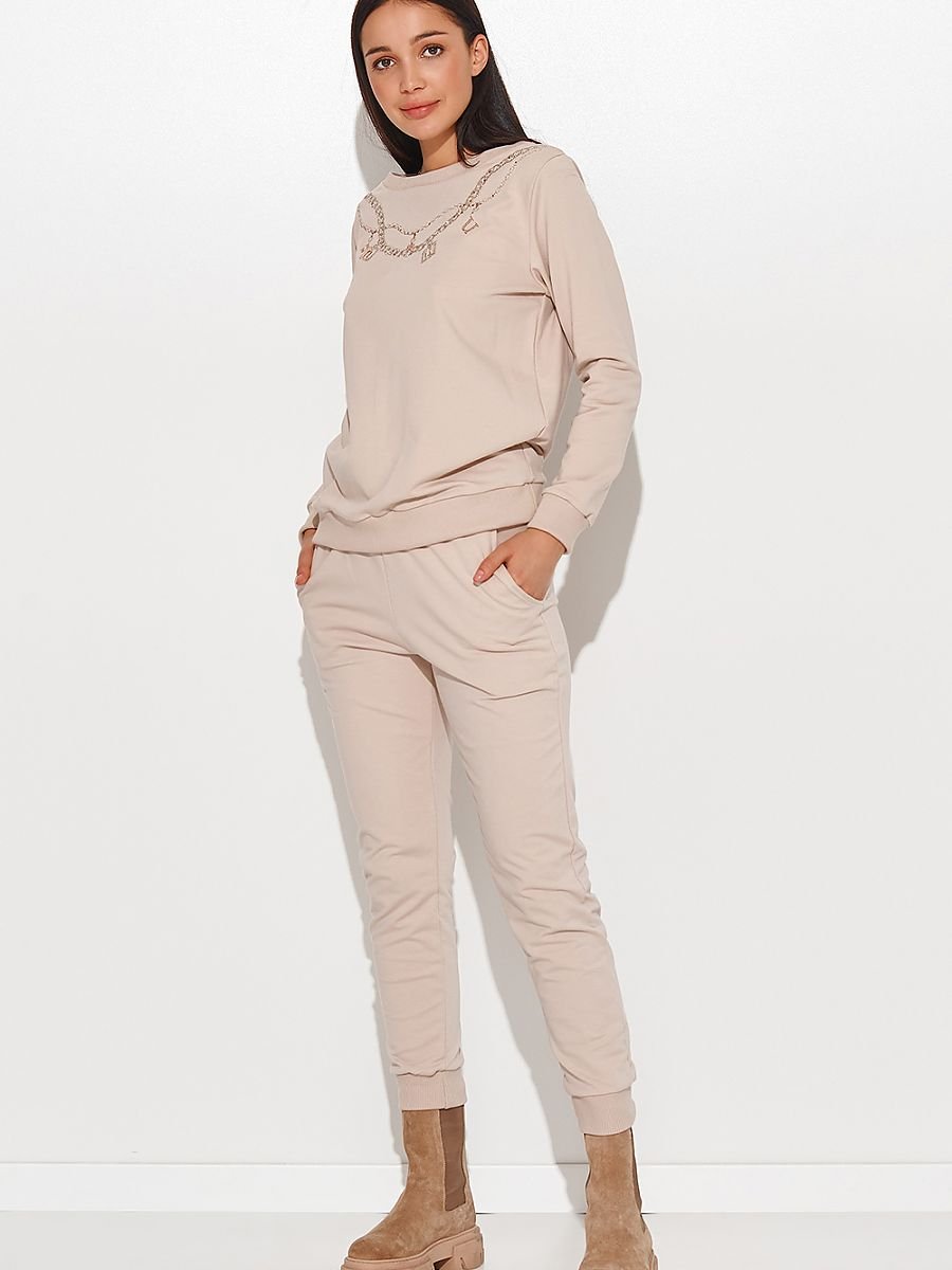 Women's sweatshirt set includes classic trousers and a sweatshirt worn over the head. The sweatshirt has a round neckline finished with a thin welt. This element is also found in the distal part of sleeves and around the waist. The sweatshirt has a beautiful embroidery imitating a chain on the front. There are also glittering crystals on the glittering thread. The trousers are straight, with side slip pockets and welts at the waist and at the end of both legs. Perfect for everyday wear as well as for work. Can be worn with elegant stilettos or sports shoes.