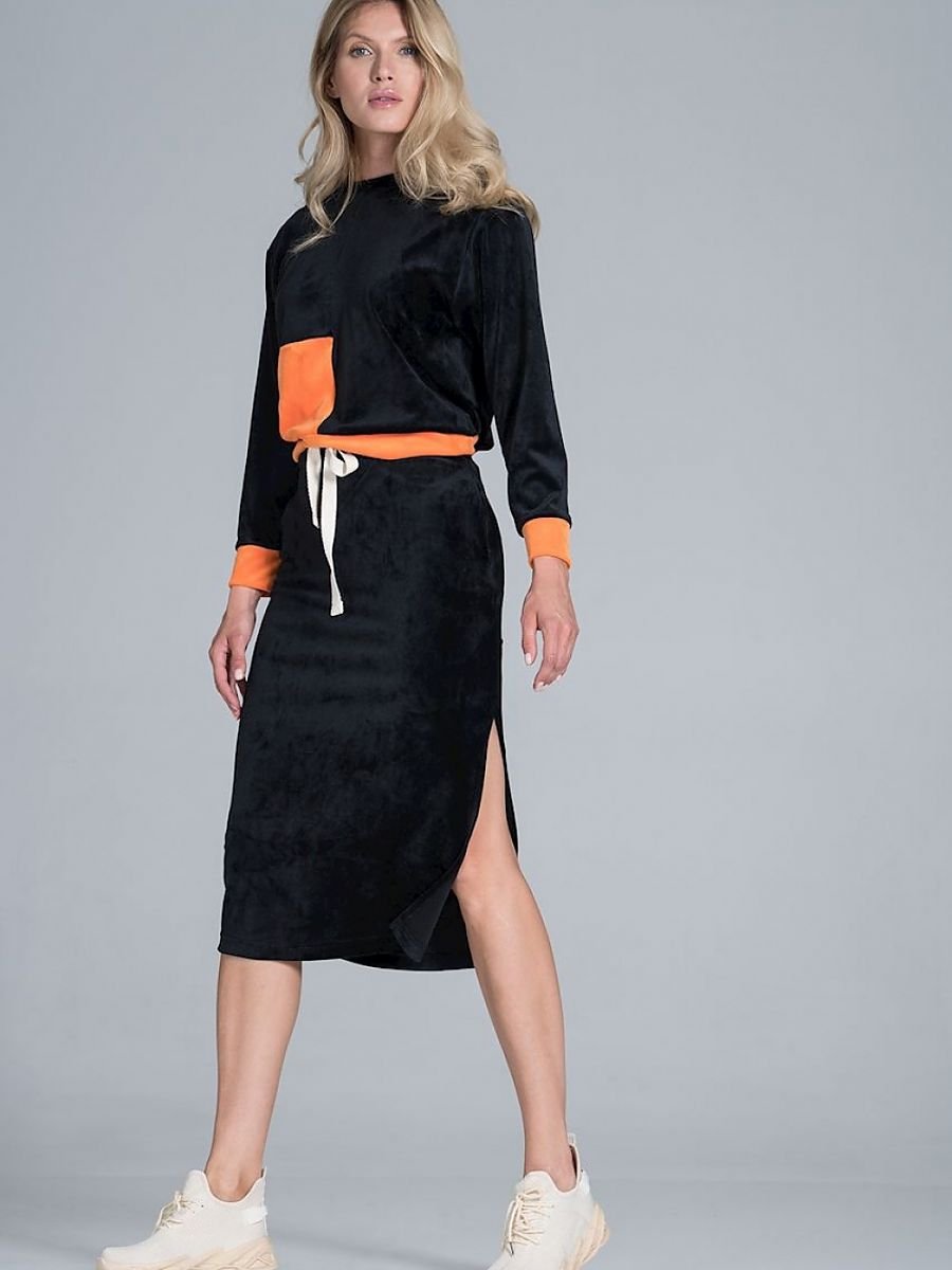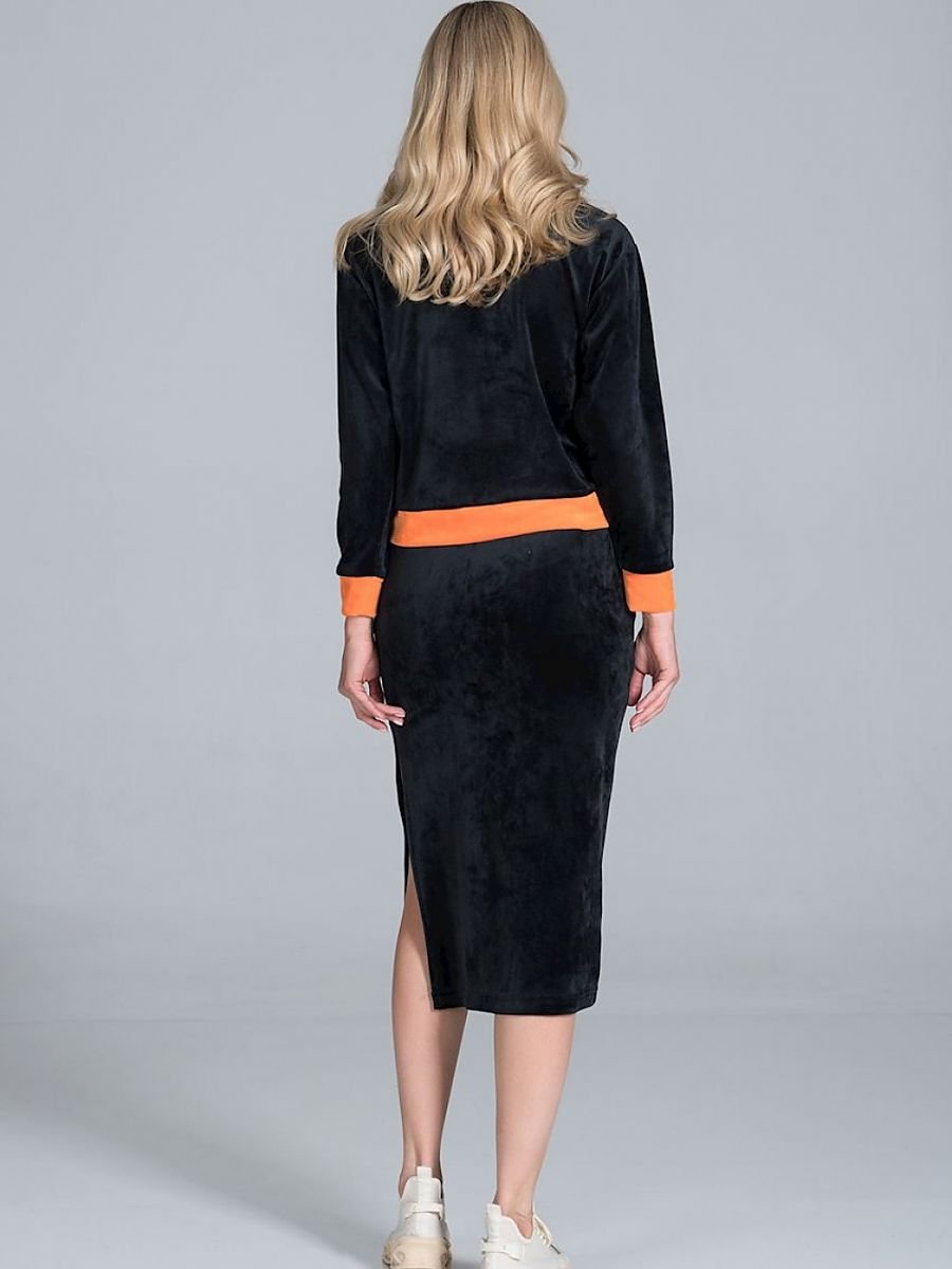 Velour set. Two-colored long-sleeve blouse plus pencil skirt with slit on the right side, wide rubber band at the waist, unlined.