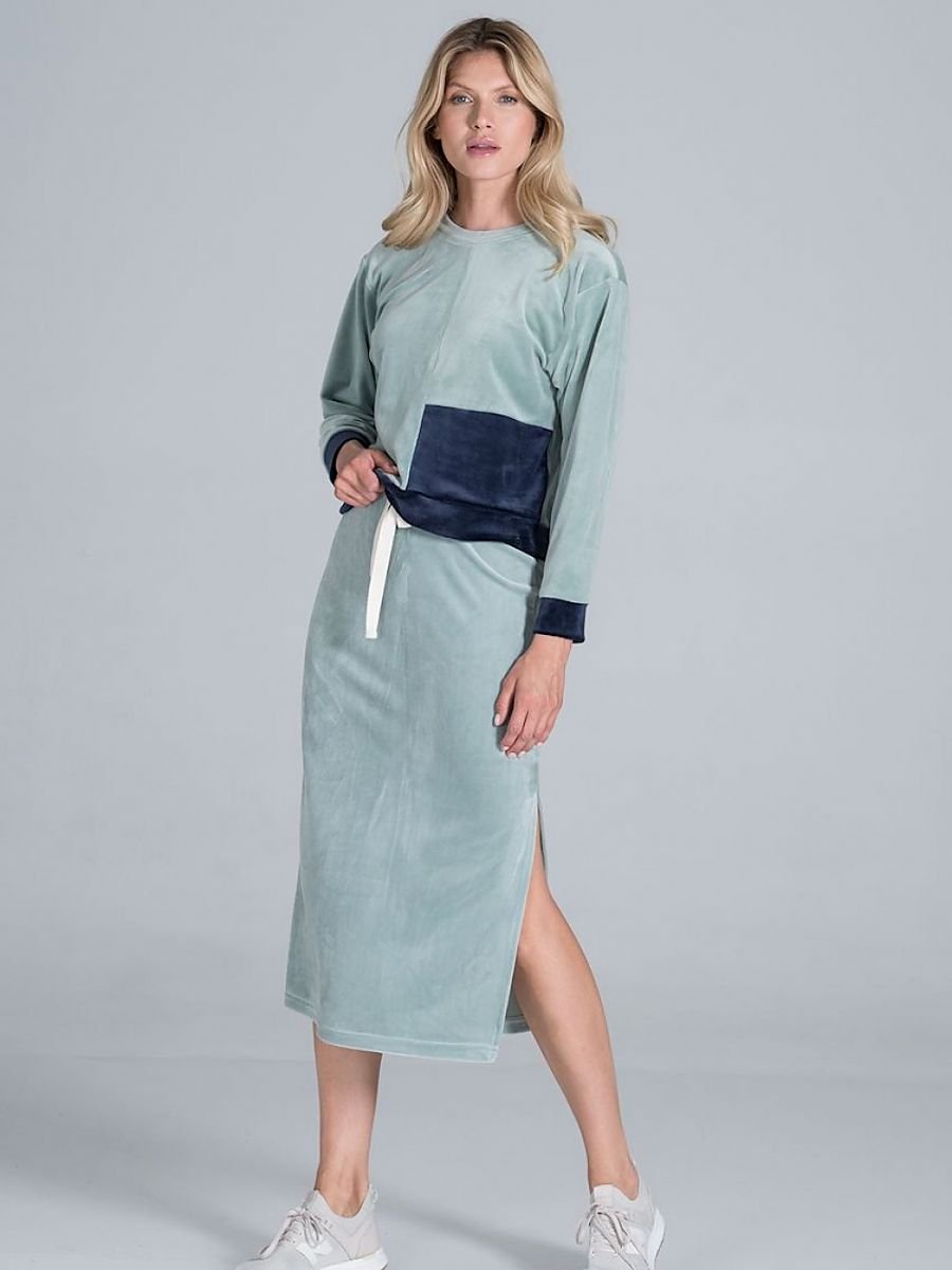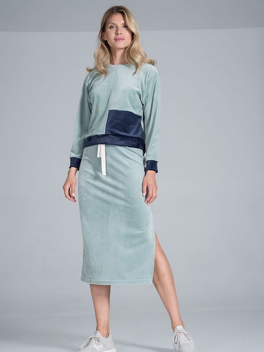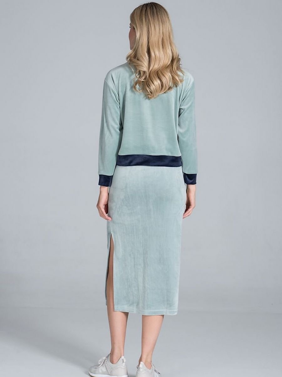 Velour set. Two-colored long-sleeve blouse plus pencil skirt with slit on the right side, wide rubber band at the waist, unlined.