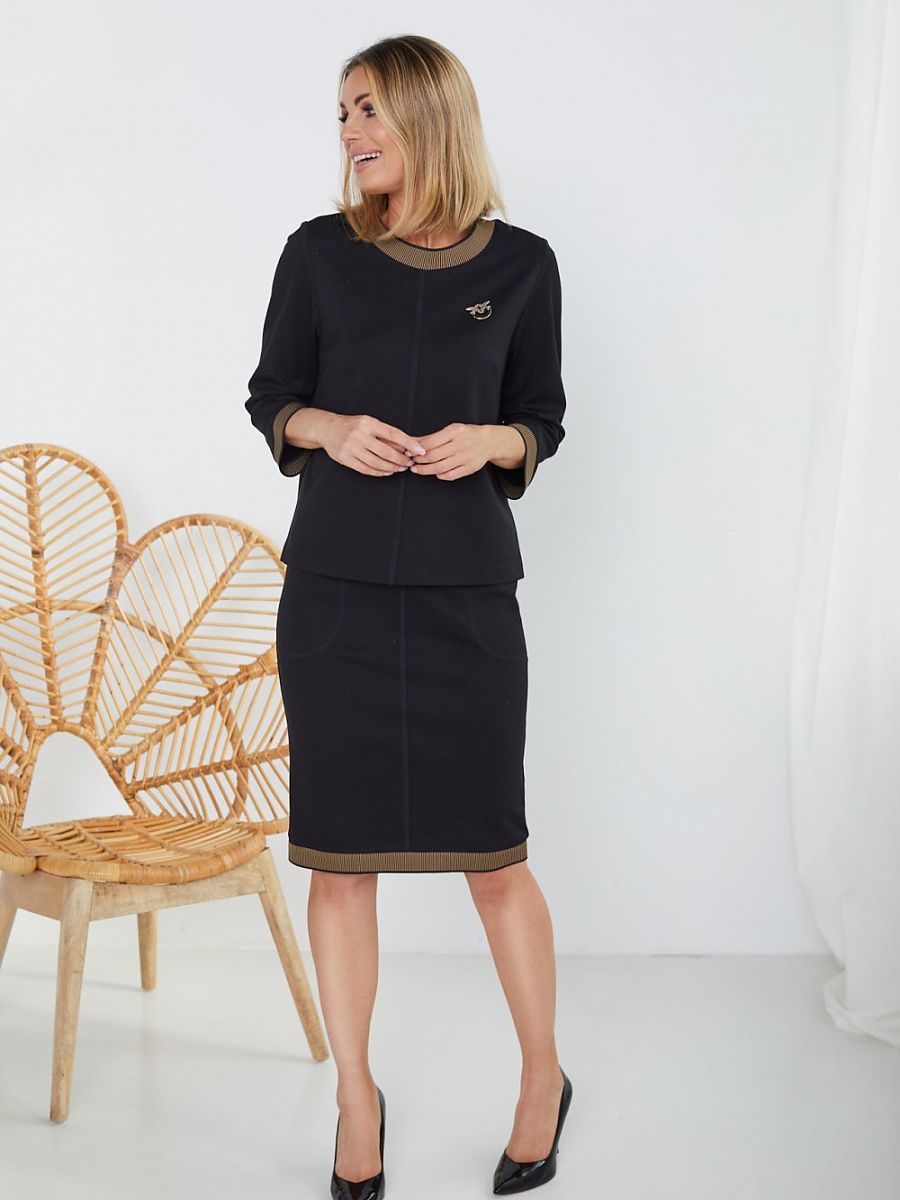 This two-piece set of women stole the hearts of our customers. It was entirely sewn from a soft knitwear type MORGAN. The upper part has a boxy form with decorative welts. Slightly fitted skirt with pockets gives a fashionable character. Wide elastic waistband on the skirt makes it fit the body perfectly. Decorated with welts on top and skirt. Decorative stitching and gold pin add attractiveness. Thoughtful cut gives comfort to women of all sizes. Unlined.