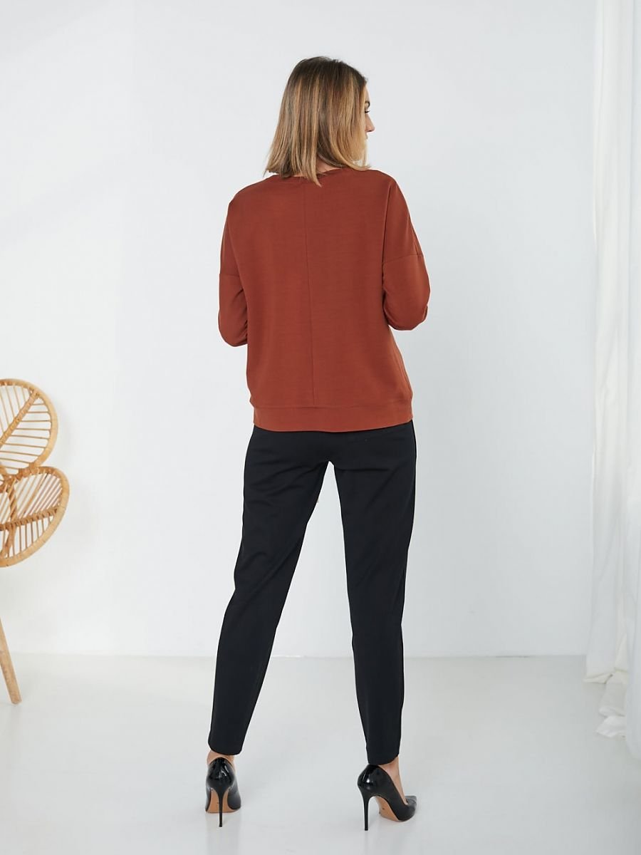 Do you value comfort and convenience? Discover our sporty and elegant set. Why is it so special? Because it was designed with a wide range of sizes and high versatility in mind. We sewed it from soft and stretchy knitted fabric of MORGAN type, which combined with stiletto shoes makes the outfit more elegant, but it also matches sporty shoes perfectly. You can therefore wear it for everyday shopping as well as for occasional meetings with friends. Careful stitching, decorative prints and metal hardware will make you feel special. Trousers are characterized by high waist and so called carrot cut. They have wide elastic waistband, additionally regulated by string. Blouse has a loose classic cut. All this to make women of different sizes feel comfortable in LaAurora clothing.
