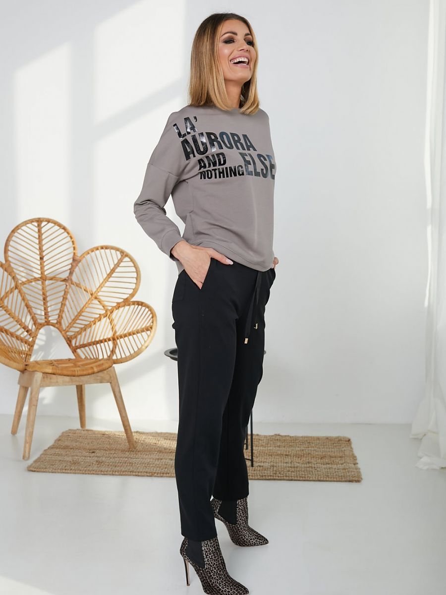 Do you value comfort and convenience? Discover our sporty and elegant set. Why is it so special? Because it was designed with a wide range of sizes and high versatility in mind. We sewed it from soft and stretchy knitted fabric of MORGAN type, which combined with stiletto shoes makes the outfit more elegant, but it also matches sporty shoes perfectly. You can therefore wear it for everyday shopping as well as for occasional meetings with friends. Careful stitching, decorative prints and metal hardware will make you feel special. Trousers are characterized by high waist and so called carrot cut. They have wide elastic waistband, additionally regulated by string. Blouse has a loose classic cut. All this to make women of different sizes feel comfortable in LaAurora clothing.