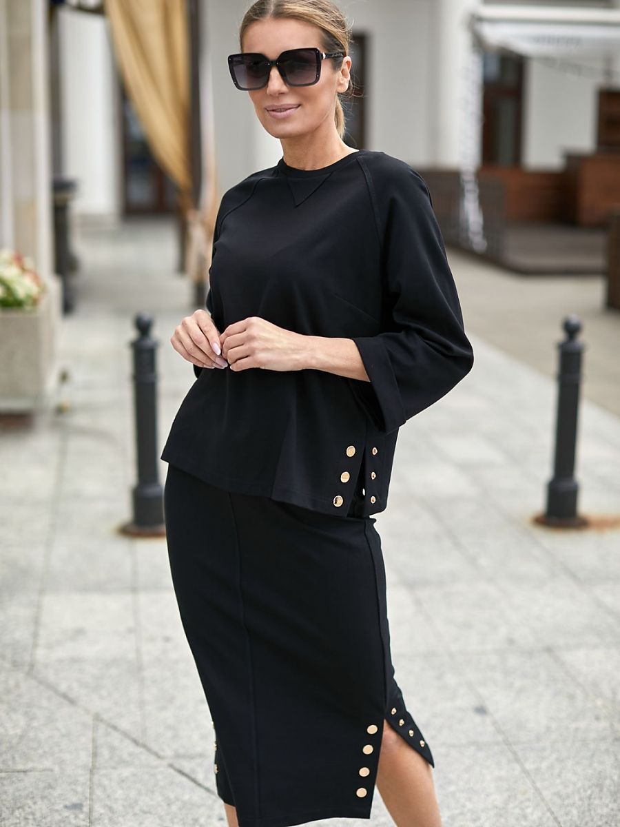 This two-piece set of women stole the hearts of our customers. It was entirely sewn from a soft knitwear type "MORGAN". The upper part has a boxy form with wider, folded sleeves. Slightly fitted 3/4 length skirt adds a fashionable character. Wide elastic band at waist makes it fit the body perfectly. Decorated with big metal buttons on the top and skirt. Decorative stitching in a form of a render along the skirt and on the joining of the sleeve and the sweatshirt add attractiveness. This well-thought-out cut gives comfort to women of all sizes. Unlined..