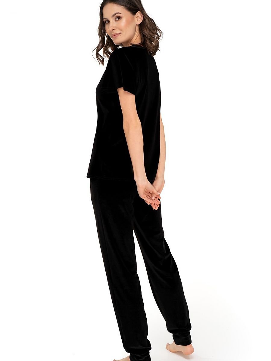 Mega trendy velour tracksuit in black color. Ideal as homewear, high quality, very feminine. The fabric of medium thickness, also works well between seasons, it is very comfortable and elastic. Top with short sleeves and a pointed neckline. The trousers are long, loose, finished with welts at the ankles. Soft elastic band and a bow at the waist. Pockets on the sides.