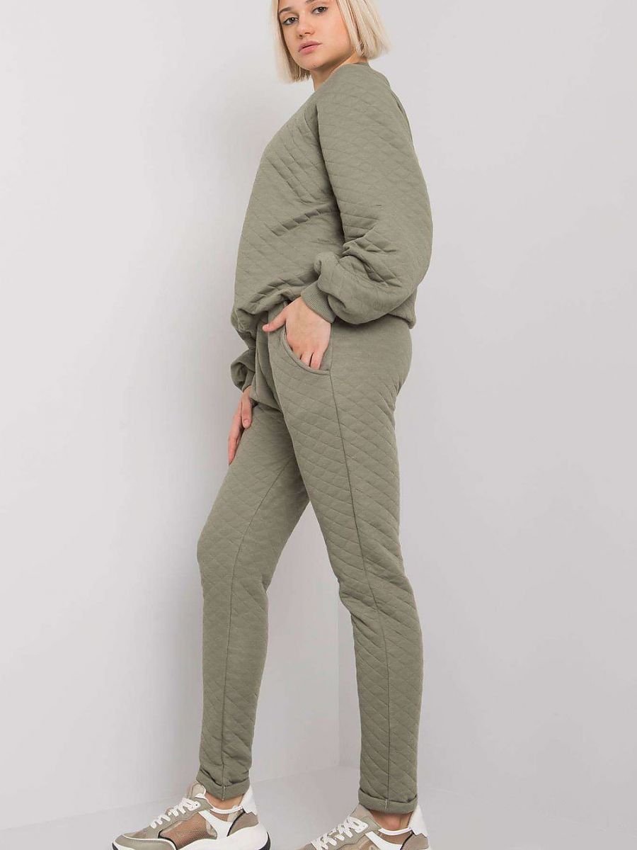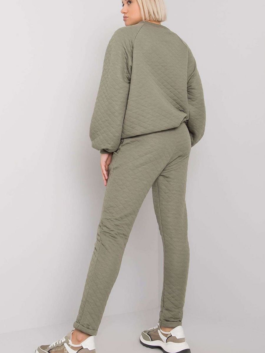 Quilted tracksuit set consisting of a sweatshirt and trousers. Long sleeve sweatshirt without hood. Sweatpants with waist tie and slip pockets.