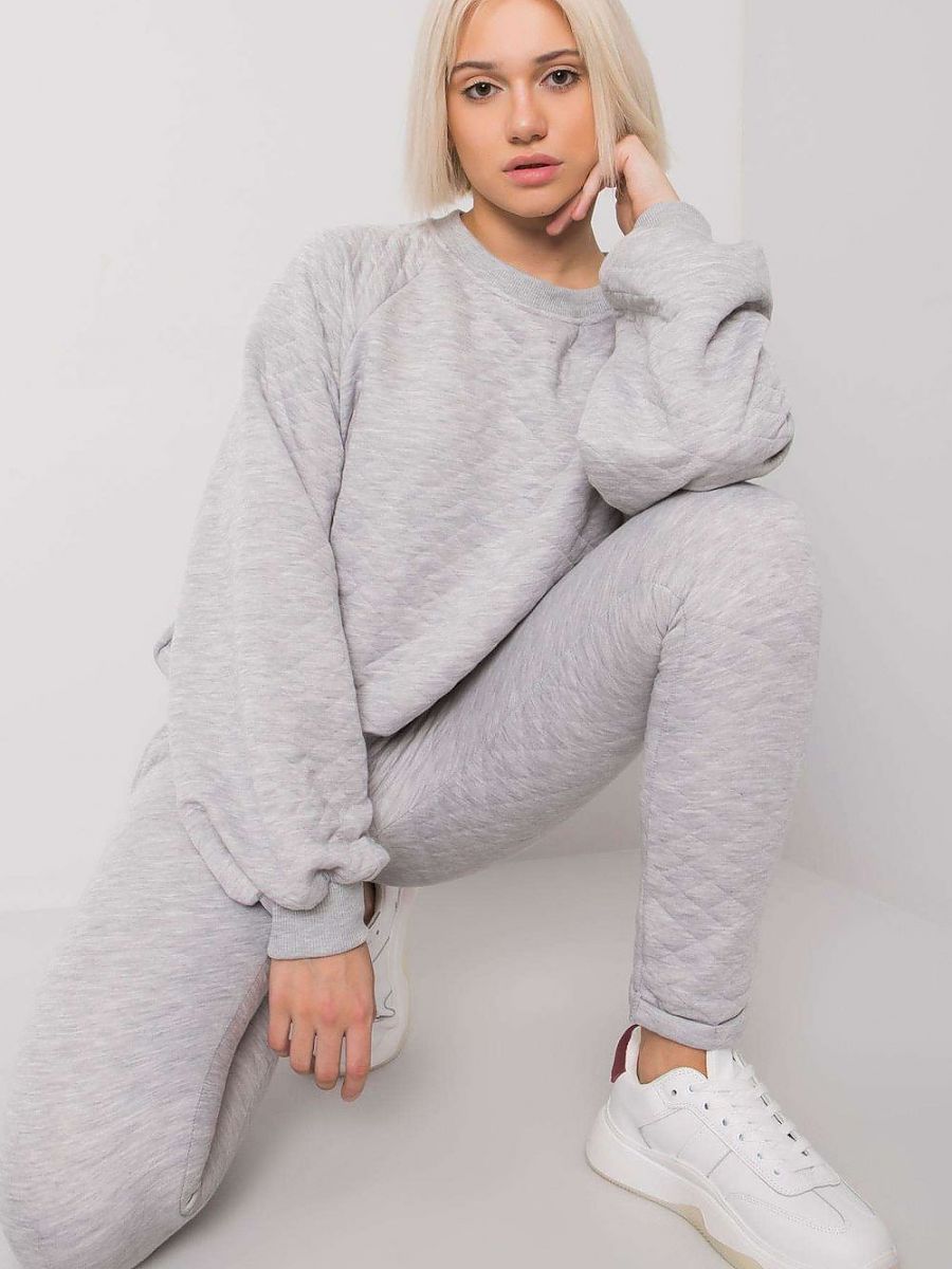 Quilted tracksuit set consisting of a sweatshirt and trousers. Long sleeve sweatshirt without hood. Sweatpants with waist tie and slip pockets.