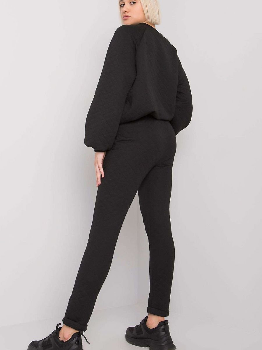 Quilted tracksuit set consisting of a sweatshirt and trousers. Long sleeve sweatshirt without hood. Sweatpants with waist tie and slip pockets.
