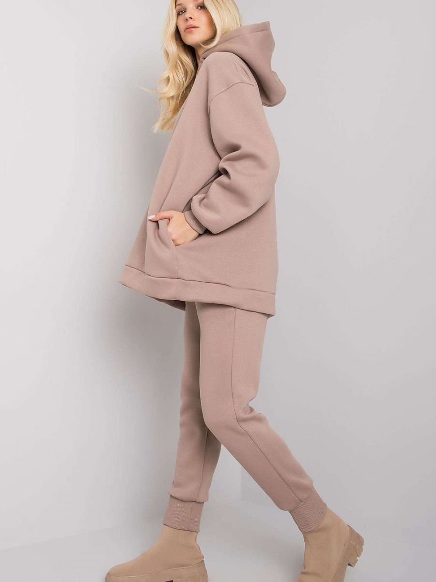 A set consisting of a sweatshirt and sweatpants. Sweatshirt put on over the head, with a hood and pockets. Straight cut trousers.