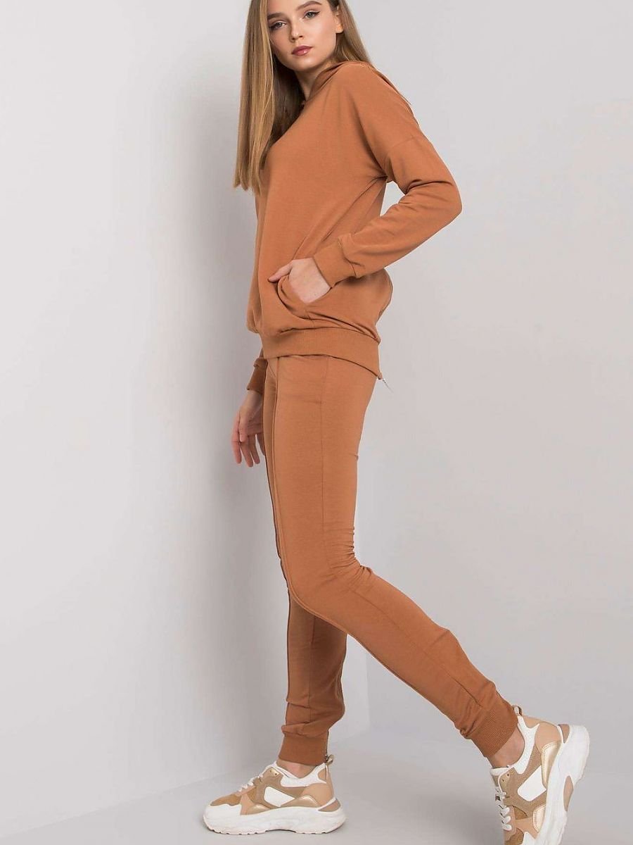 Tracksuit set consisting of a sweatshirt and pants. Sweatshirt with long sleeves, hood, pockets and decorative zipper on the back. Pants with slip pockets.