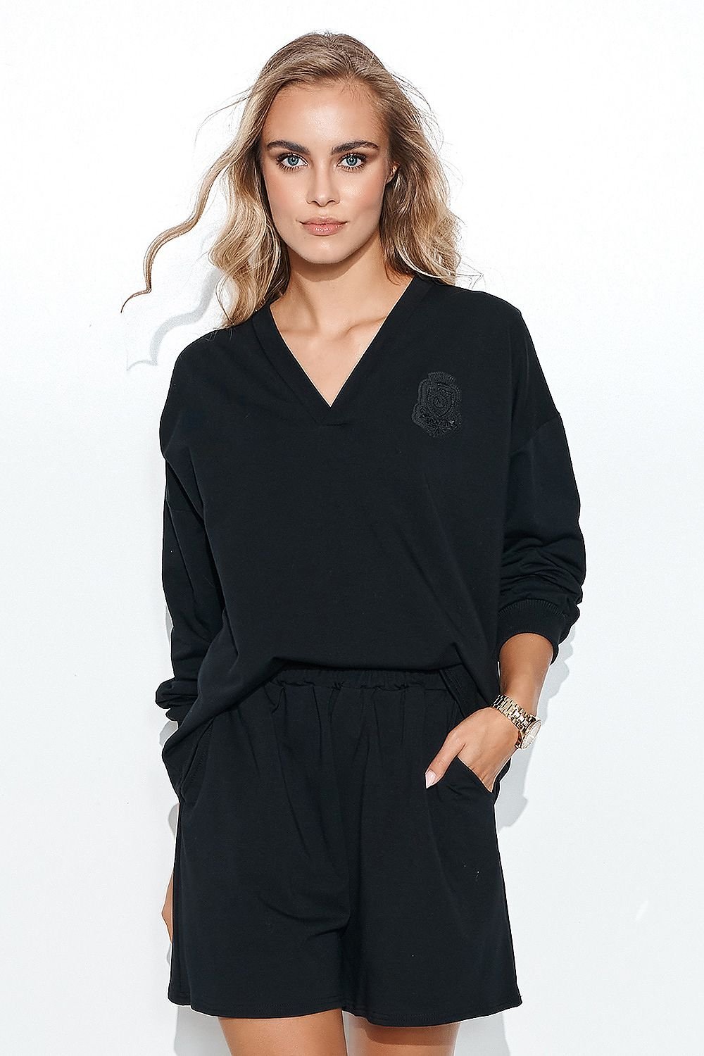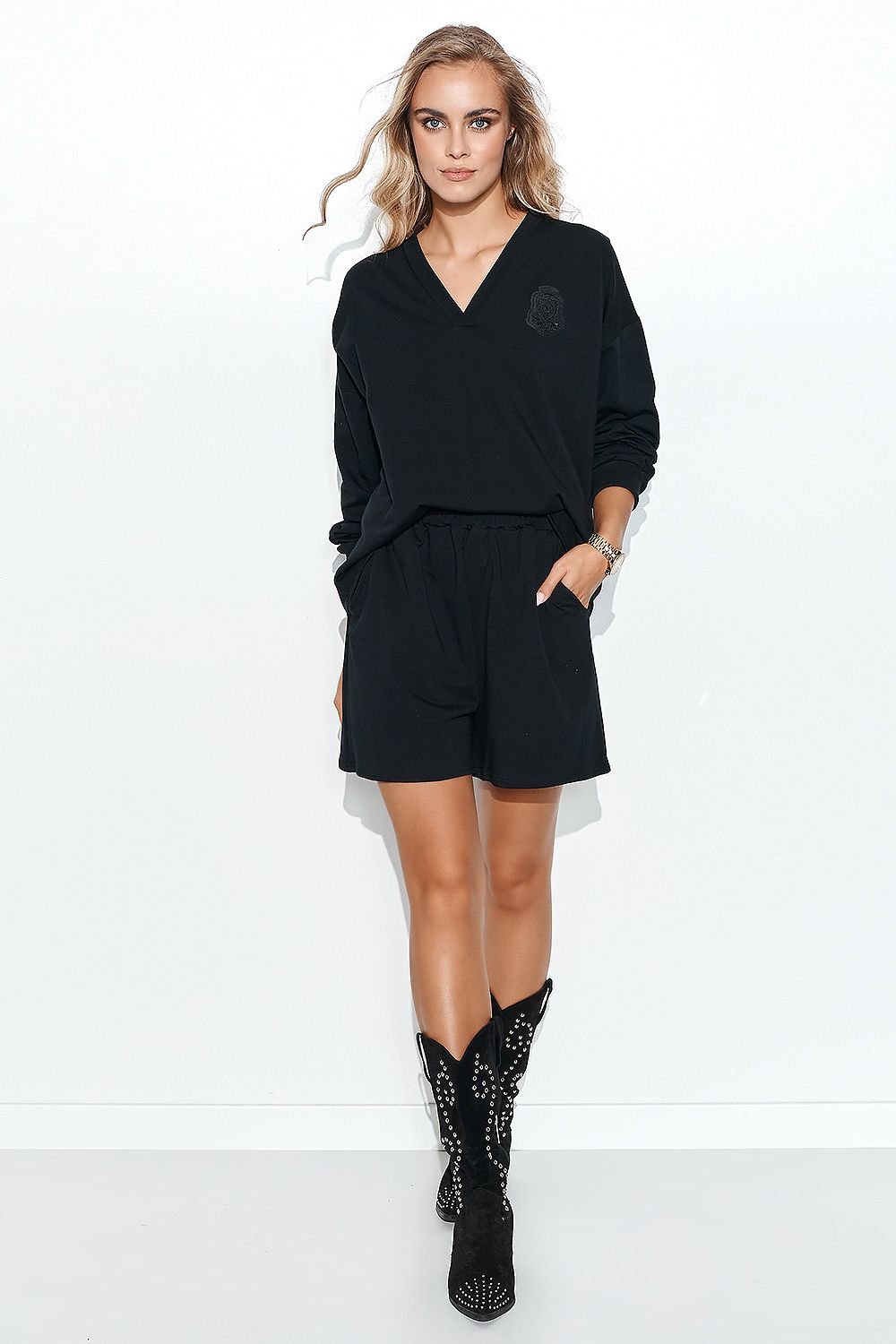 Extremely casual and lightweight women's sweatshirt set, in which you pass all spring and summer. The oversize sweatshirt has long sleeves finished with a welt. It is airy and very casual, made of thin sweatshirt knit. It is a minimalistic model of a sweatshirt, with a small tab on the front, in the side part. Women's fashionable shorts are also casual. They have side pockets and a thick welt at the waist, thanks to which they do not move while being worn. The set is very universal. It will be perfect for a summer walk or outdoor recreation. Match it with stylish sneakers or comfortable sneakers, a baseball cap and enjoy freedom in warm days.