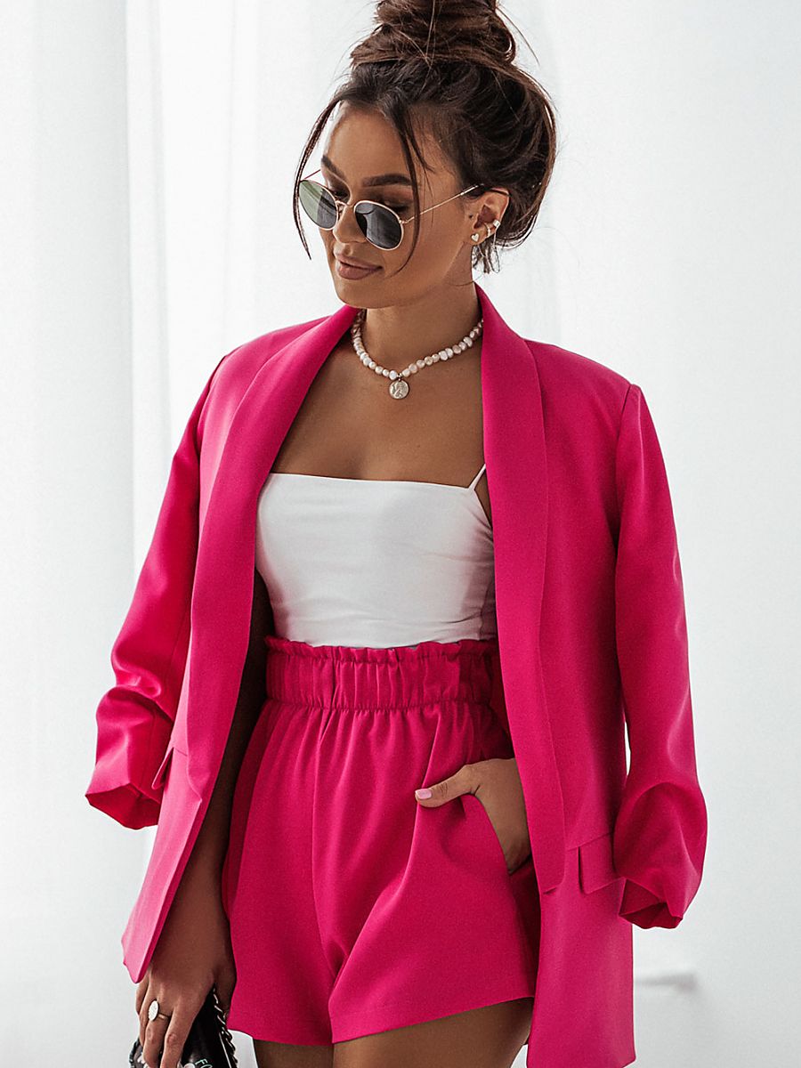 You will love this set: jacket and short shorts are the HIT of the season! Jacket has a slightly oversized cut, but thanks to a subtle waist it fits perfectly on every body. Thin shoulder pads sewn in. 3/4 sleeves with creases. Decorative lapels and flaps imitating pockets add elegance. Jacket is not lined. Thanks to that it is extremely light and airy, great to wear. Comes with short, slightly flared shorts with decorative elasticized waist and pockets. The perfect cut optically lengthens the silhouette. Wear it as a set or separately - you decide! Mix it & fit it! The set was designed and sewn in Poland. Elastic at waist stretches up to 10 cm.