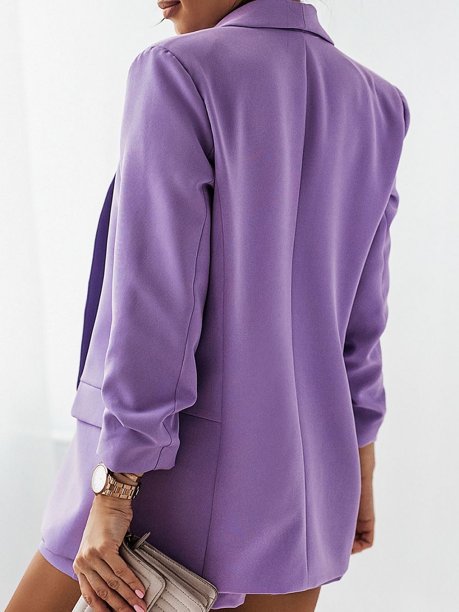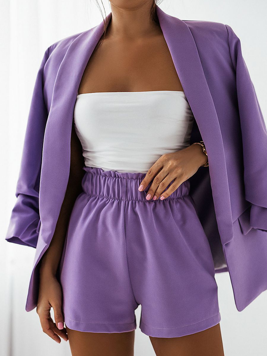 You will love this set: jacket and short shorts are the HIT of the season! Jacket has a slightly oversized cut, but thanks to a subtle waist it fits perfectly on every body. Thin shoulder pads sewn in. 3/4 sleeves with creases. Decorative lapels and flaps imitating pockets add elegance. Jacket is not lined. Thanks to that it is extremely light and airy, great to wear. Comes with short, slightly flared shorts with decorative elasticized waist and pockets. The perfect cut optically lengthens the silhouette. Wear it as a set or separately - you decide! Mix it & fit it! The set was designed and sewn in Poland. Elastic at waist stretches up to 10 cm.