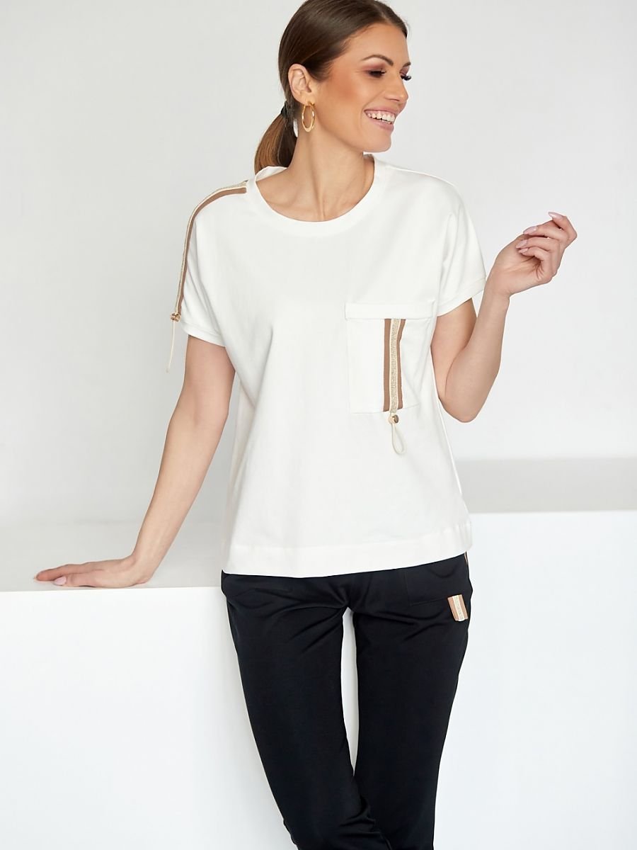 Sporty set made of stretchy knitwear for spring days. Decorative elements in the form of a knitted ribbon with golden lurex and metal stoppers add charm.