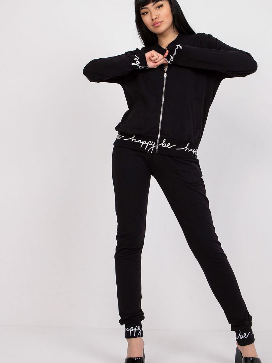 A set consisting of a blouse and long pants. Blouse with long sleeves, zipper, pockets on the sides. Pants with a drawstring, pockets on the sides. Waistbands with contrasting inscription.