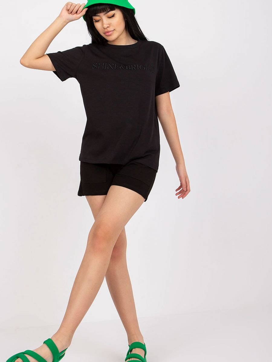 Set consisting of a blouse and shorts. Blouse with short sleeves, inscription on the front. Shorts with a drawstring and slip pockets on the sides.