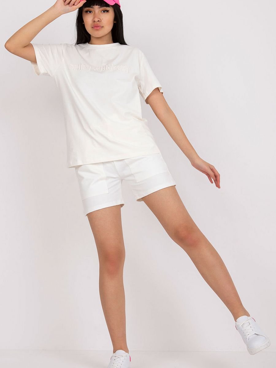 Set consisting of a blouse and shorts. Blouse with short sleeves, inscription on the front. Shorts with a drawstring and slip pockets on the sides.