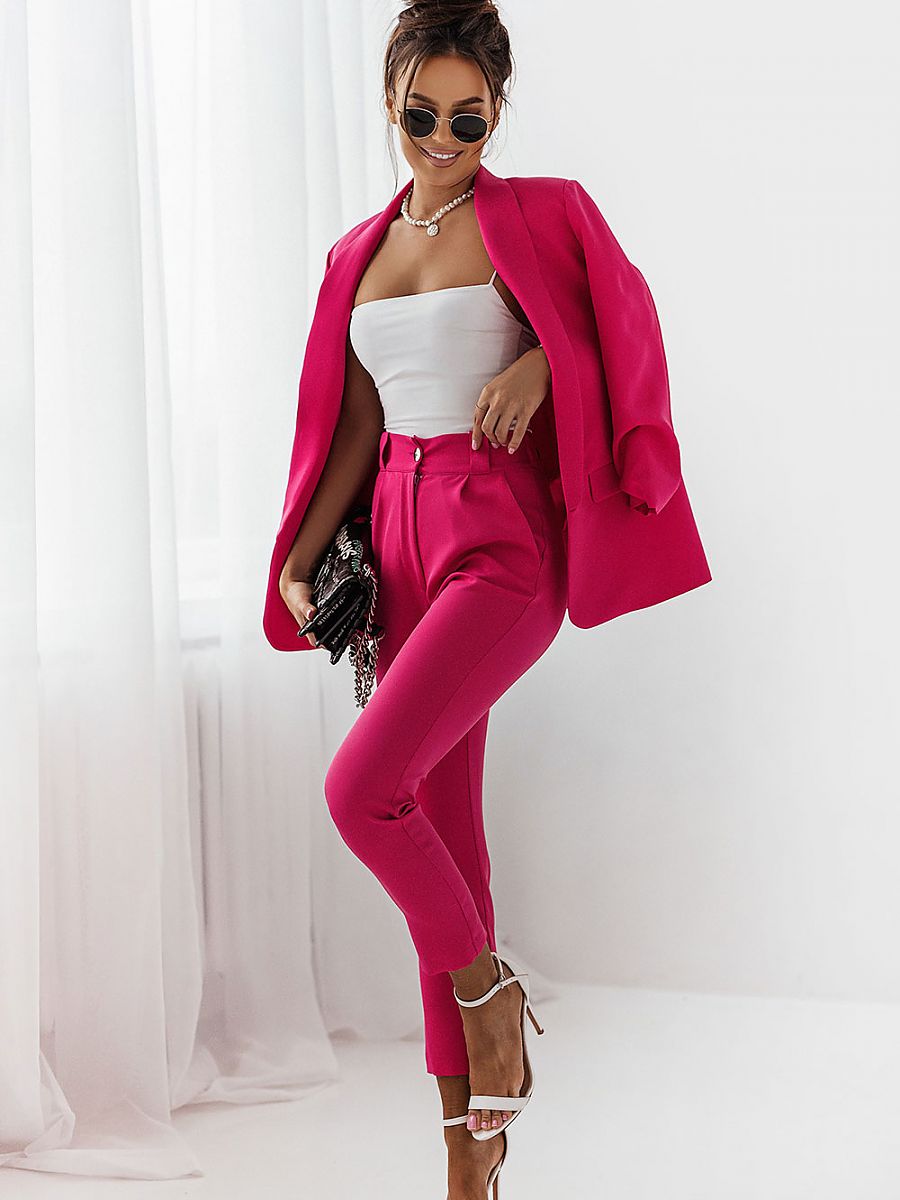 You will love this set: total look jacket and pants ala cigarillos is the HIT of the season! A set suitable for all kinds of business meetings or family celebrations. Jacket has a slightly oversized cut, but thanks to a subtle waist it looks great on every figure. Thin pads sewn on the shoulders. 3/4 sleeves with creases. Decorative lapels and flaps imitating pockets add elegance. Jacket can be used in elegant stylizations with stilettos, but will also work very well in a casual version with jeans and a white t-shirt. IMPORTANT the jacket is not lined. Thanks to that it is extremely light and airy, great to wear. Complete with classic, elegant 7/8 length ala cigarette pants with a high waist, decorative gold buttons and pockets. Elegance and comfort in one, this set is a must have in your closet! Wear it as a set or separately - decide for yourself! Mix it & fit it!