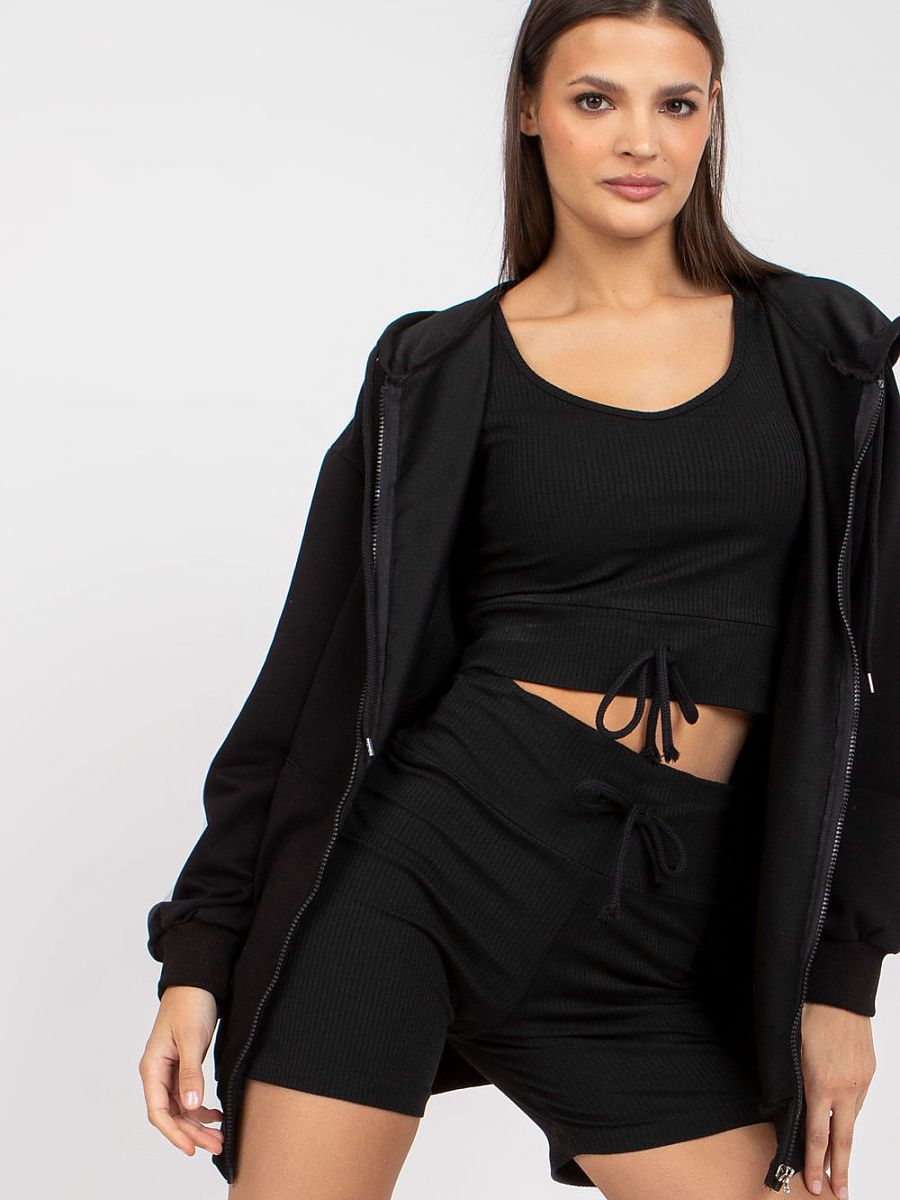 Set consisting of a sweatshirt, T-shirt and shorts. Sweatshirt with a hood, zipped pockets. T-shirt with short sleeves, V neckline. Shorts with high waist, decorative binding on the front. Length in table: 1 shirt, 2 blouse, 3 shorts. Bust circumference: 1 T-shirt, 2 tops.