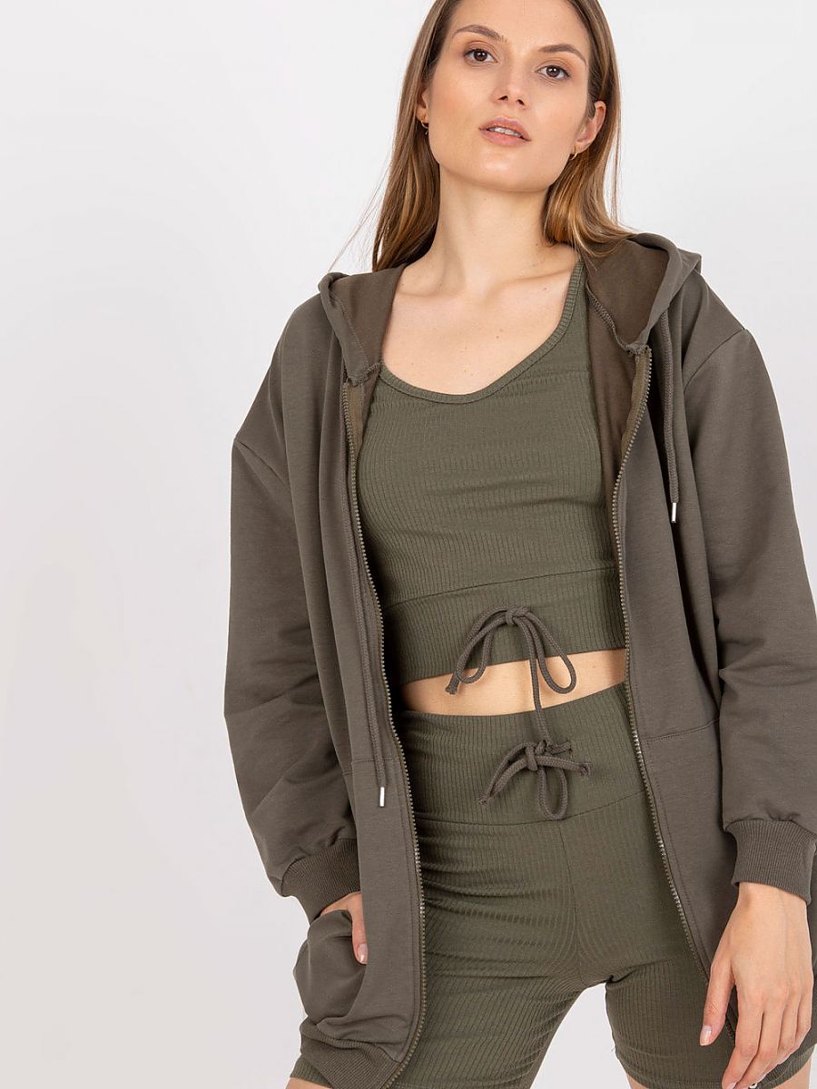 Set consisting of a sweatshirt, T-shirt and shorts. Sweatshirt with a hood, zipped pockets. T-shirt with short sleeves, V neckline. Shorts with high waist, decorative binding on the front. Length in table: 1 shirt, 2 blouse, 3 shorts. Bust circumference: 1 T-shirt, 2 tops.