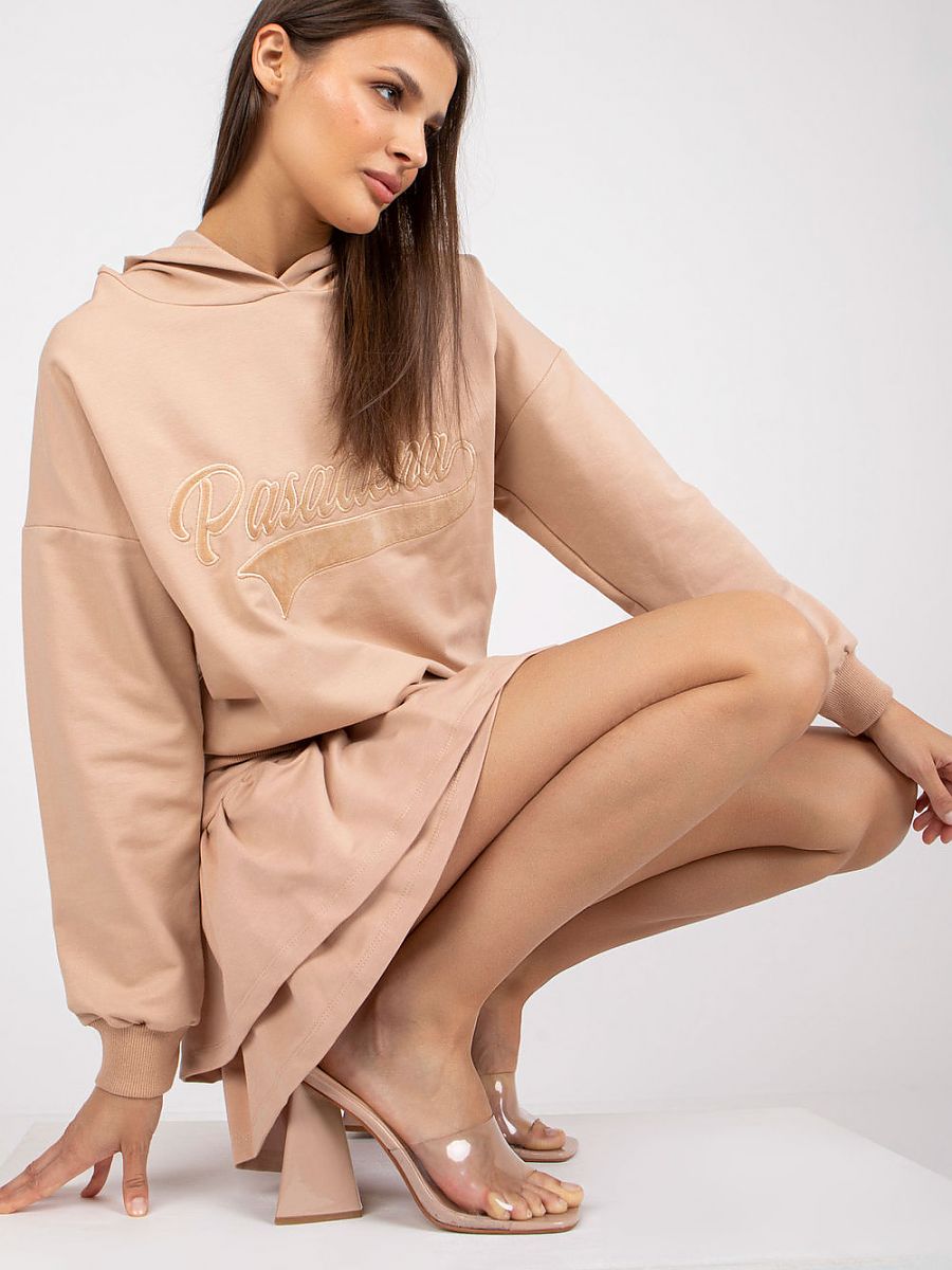 A set consisting of a sweatshirt and a skirt. Blouse with long sleeves, hood and patch on the front. Skirt with high waist, frills and elastic waistband.