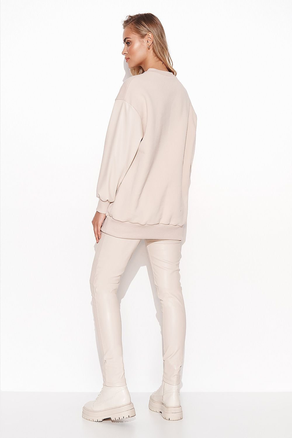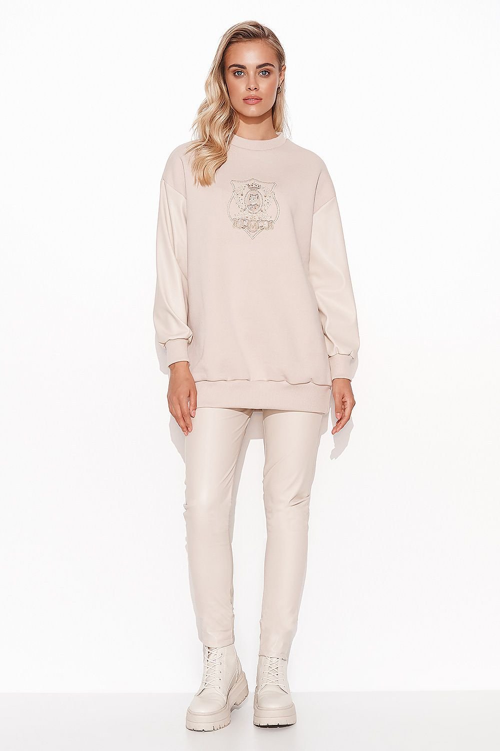 Women's tracksuit set for a real cat lady. The set consists of a sweatshirt tucked in over the head and leather matching leggings. The sweatshirt has leather long sleeves finished with ribbed cuffs. A decorative patch with an animal motif was sewn on the front. The sweatshirt is characterized by a casual cut and a length that covers the buttocks. That's why it is a perfect combination with pants matched with it. This is a set that you can wear with elegant stilettos, boots or sporty sneakers. It will prove perfect for work and leisure.
