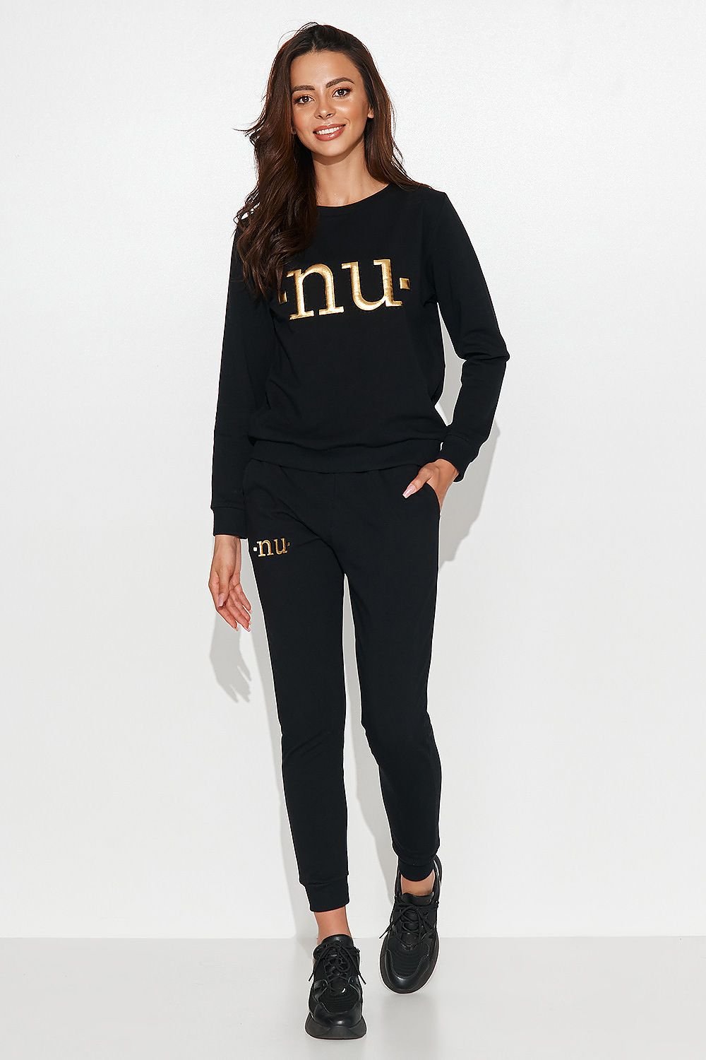 A lightweight women's tracksuit set. The set consists of a simple sweatshirt worn over the head and classic long-leg pants. A decorative element in the form of an applique with the Numinou logo is present on both the sweatshirt and the pants. The set has welts sewn in strategic places, such as the ends of the sleeves and legs. The blouse has a round neckline and a straight cut, so it looks best on petite figures with small breasts. The pants are sewn with two practical side slip pockets.