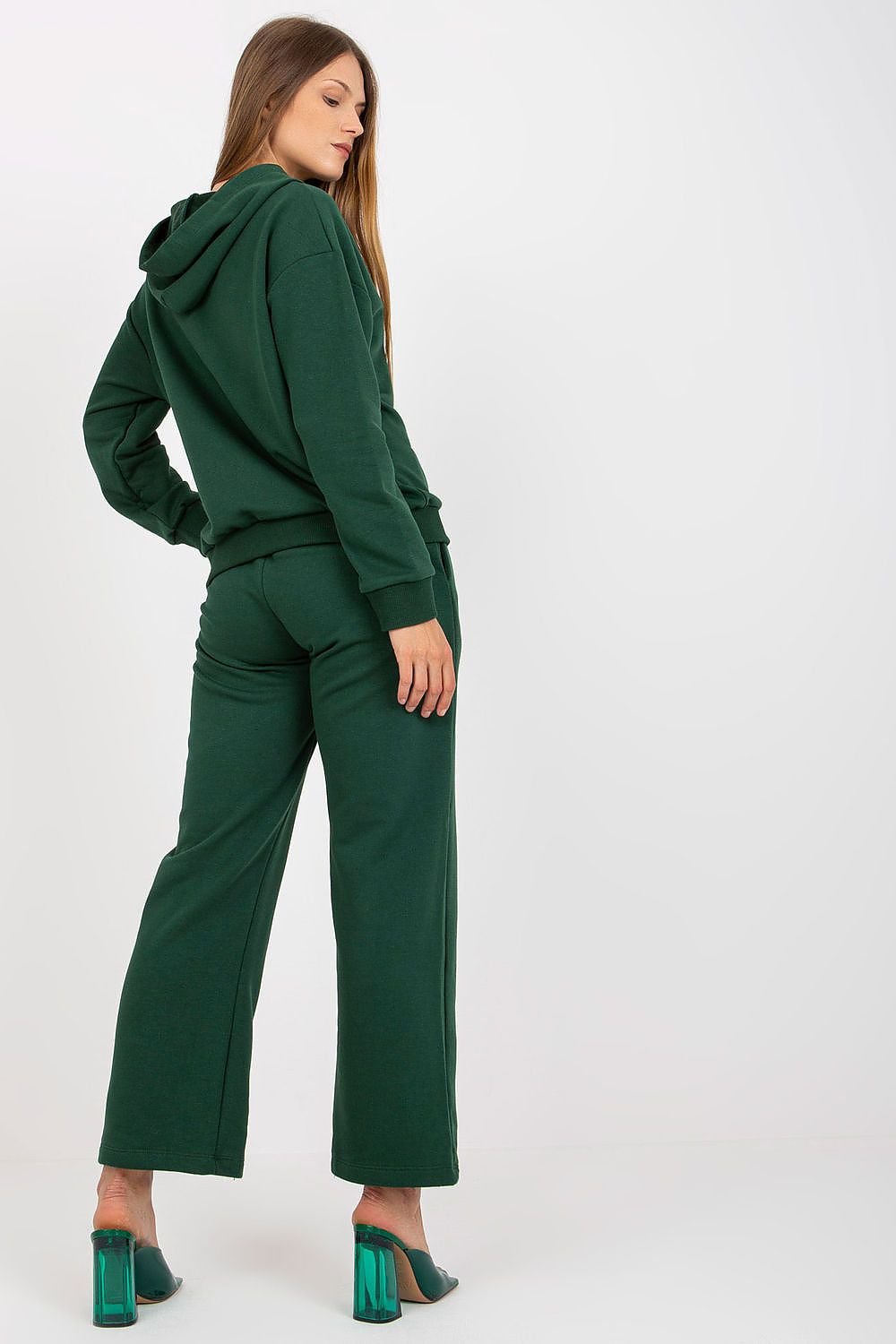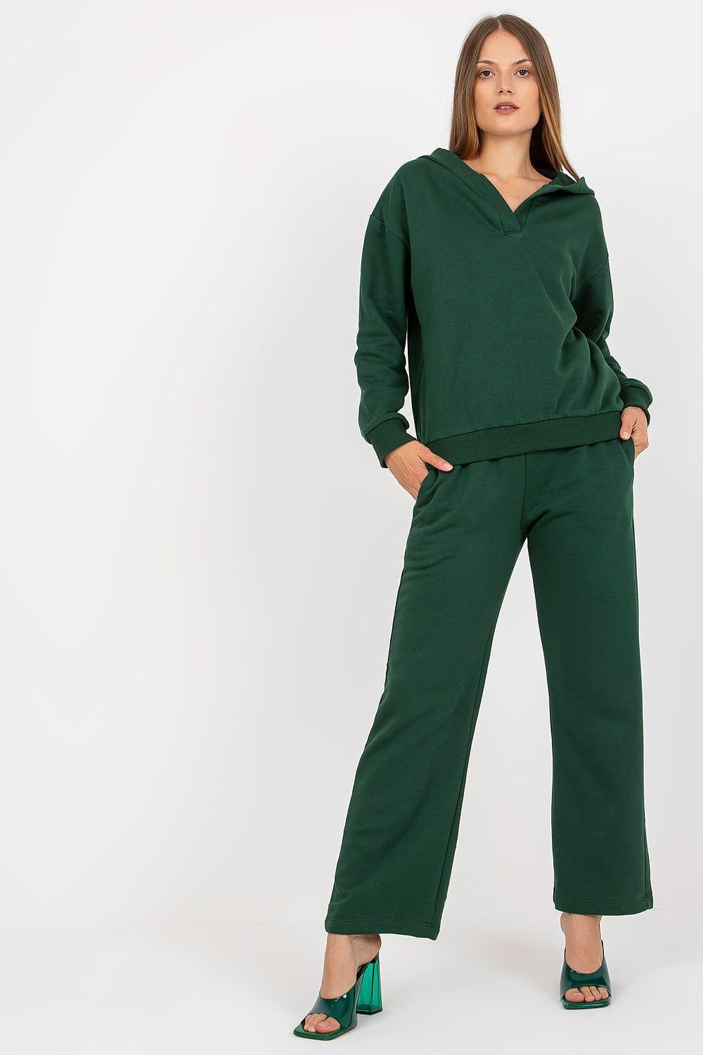 Women's sweatshirt set consisting of a sweatshirt and long pants. Sweatshirt with long sleeves, and a hood. Long pants with elastic waistband, slip pockets on the sides.