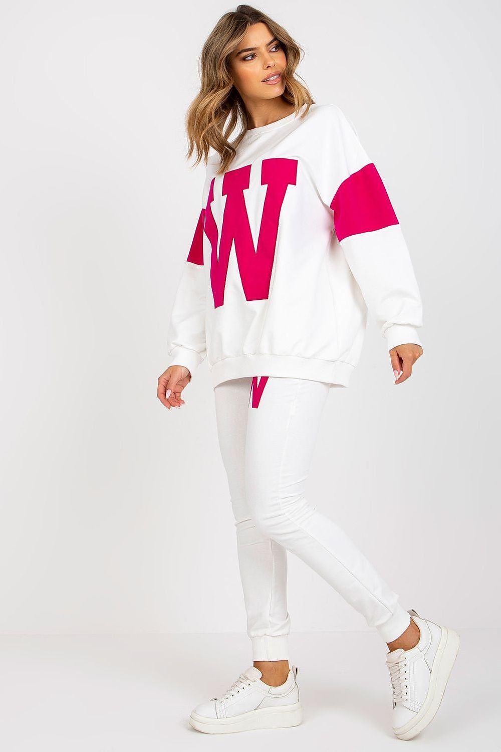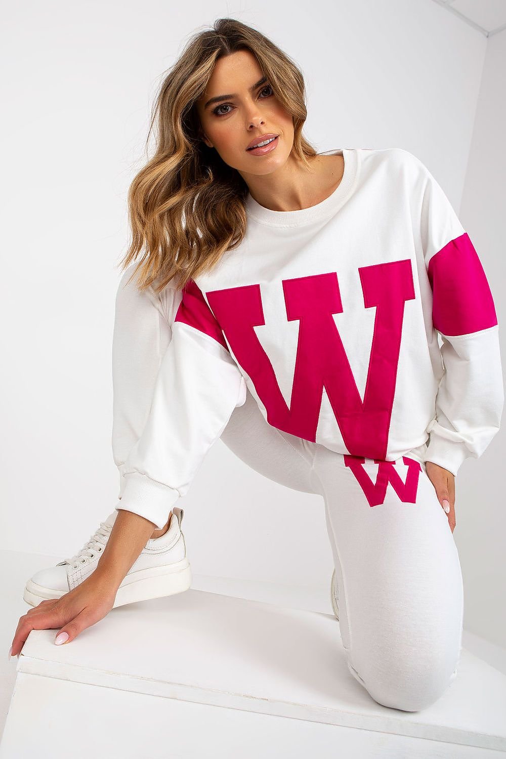 Women's tracksuit set consisting of a sweatshirt and long pants. Sweatshirt of loose cut, with long sleeves. Long pants with a tailored cut, waistband with tie straps, slip pockets on the sides.