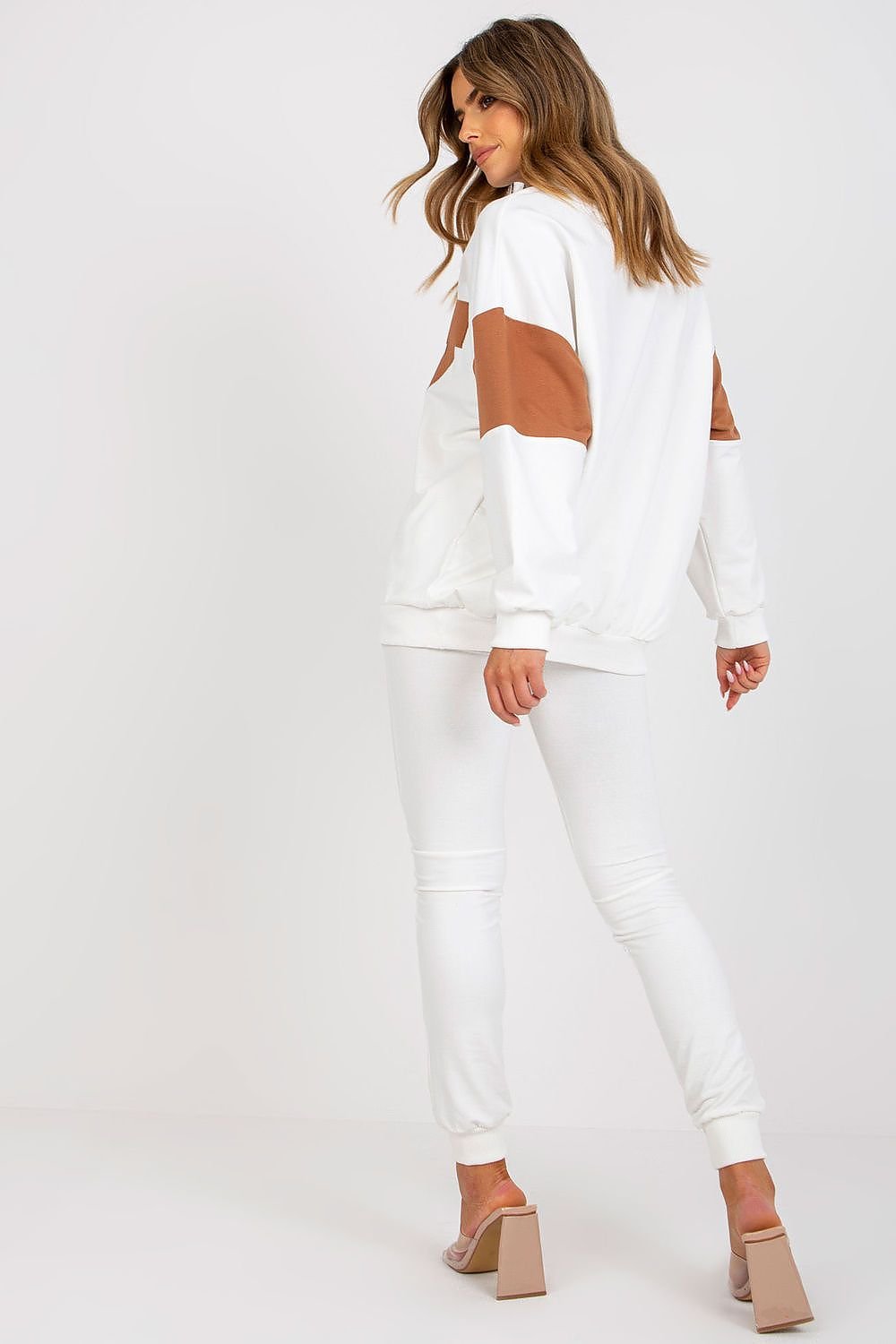 Women's tracksuit set consisting of a sweatshirt and long pants. Sweatshirt of loose cut, with long sleeves. Long pants with a tailored cut, waistband with tie straps, slip pockets on the sides.