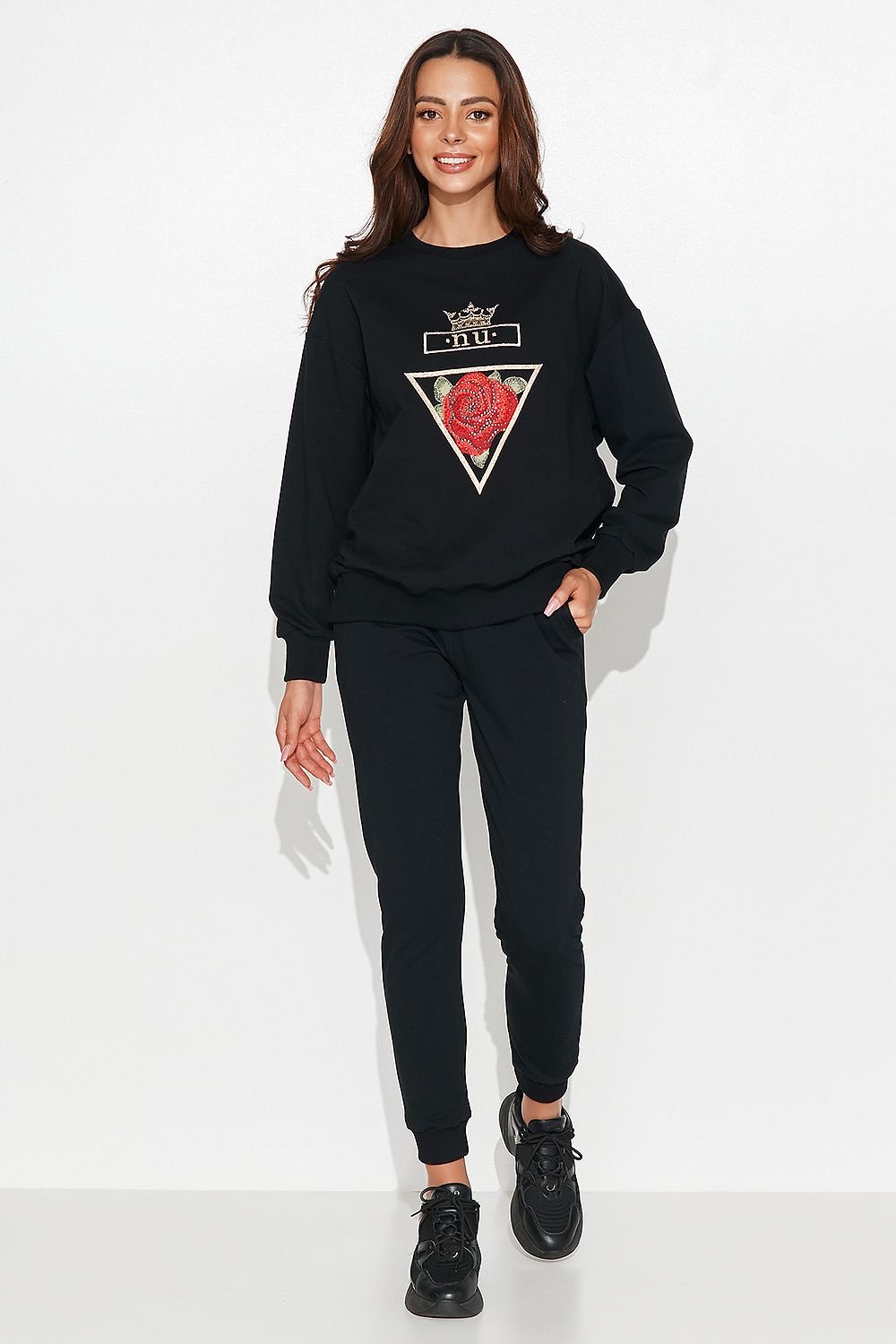 Cotton women's tracksuit set, comes in a simple cut that will work for most figures. The cotton knit fabric is pleasant to the touch and breathable. For this reason, it is a set that can be worn all year round. The blouse, tucked in over the head, has a round neckline and is finished with ribbed cuffs. On the front it has a beautiful rose motif, decorated with gold thread and crystals. At the top of the applique is a crown with the Numinou logo. The perfect complement, to such a spectacular blouse, are pants with a straight leg. Thanks to the elastic sewn on the waist line, the pants fit perfectly on the figure. On the sides, slip pockets are present. The set comes in black.