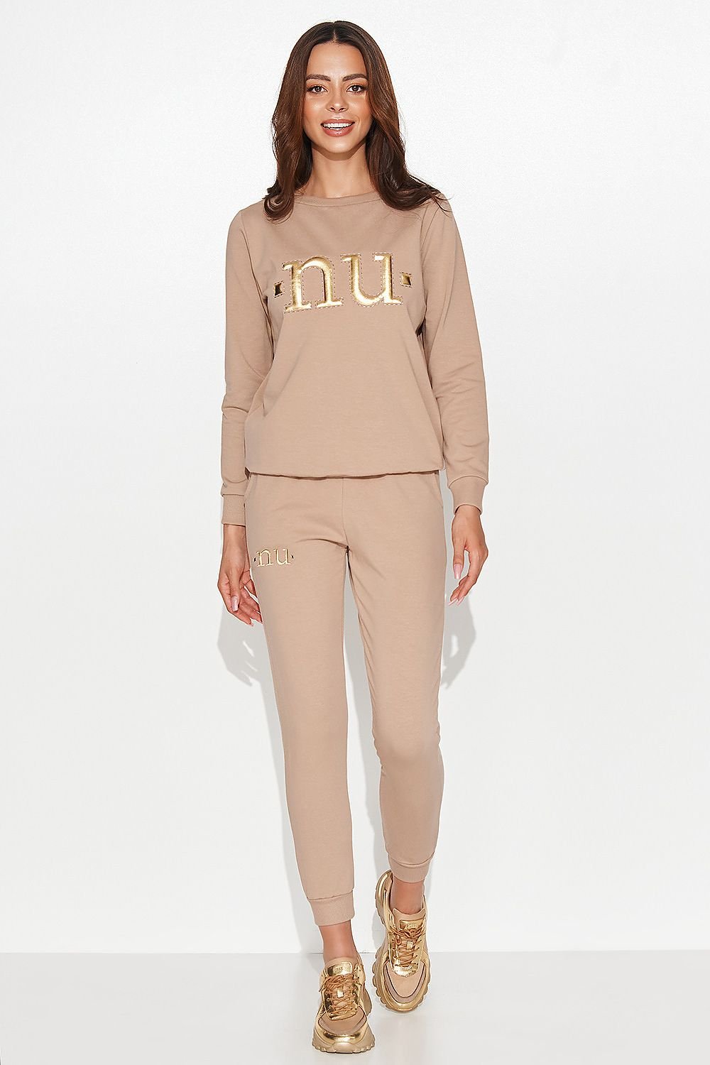 A lightweight women's tracksuit set. The set consists of a simple sweatshirt worn over the head and classic long-leg pants. A decorative element in the form of an applique with the Numinou logo is present on both the sweatshirt and the pants. The set has welts sewn in strategic places, such as the ends of the sleeves and legs. The blouse has a round neckline and a straight cut, so it looks best on petite figures with small breasts. The pants are sewn with two practical side slip pockets.