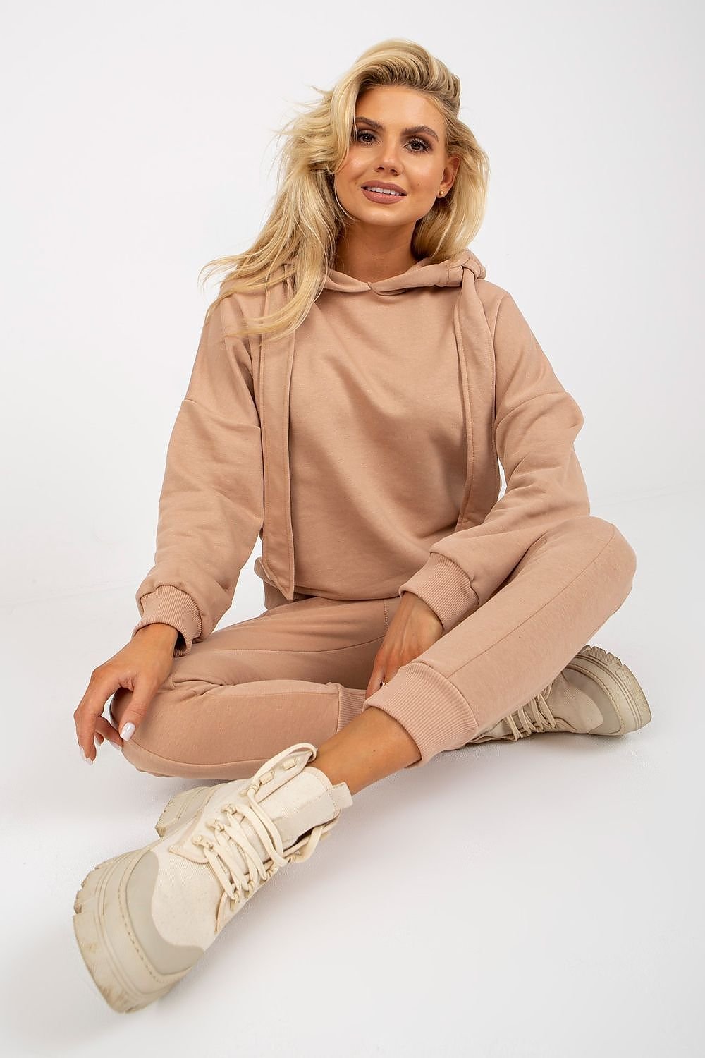 A sweatshirt set consisting of a sweatshirt and pants. Sweatshirt with long sleeves and a hood. Sweatpants with wide elastic band, slip pockets on the sides.