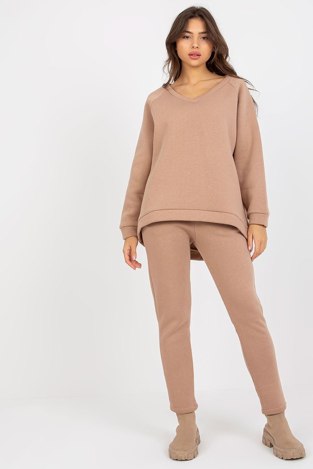 Women's sweatshirt set consisting of a sweatshirt and pants. Sweatshirt with long sleeves and a serape neckline. Long pants with slip pockets.
