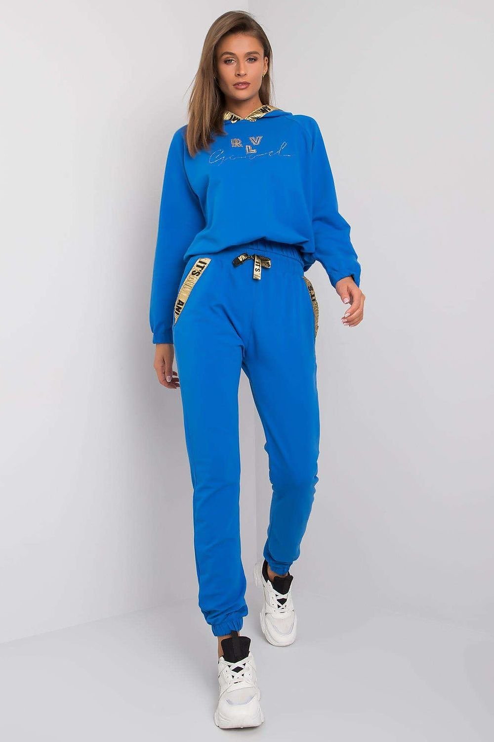 A sweatshirt set consisting of a sweatshirt and pants. Sweatshirt with long sleeves and a hood. Long pants with waist tie and slip pockets.
