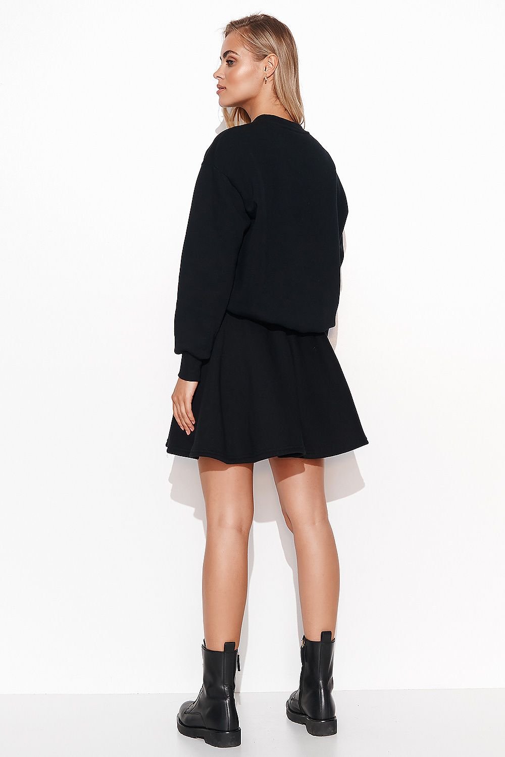 A sweatshirt set, consisting of a sweatshirt and a mini skirt. The set is made of soft and insulated sweatshirt knit. The sweatshirt is tucked in over the head. It has long sleeves and a round neckline. On the front of the sweatshirt a subtle application with the letter M is present, around which teardrop-shaped crystals have been sewn. The mini skirt is airy and girly. It has a thick drawstring waist, so it does not migrate when worn. The skirt is also made of soft and warm knit fabric. Therefore, this set can be worn even in winter, for example, with tights and boots.