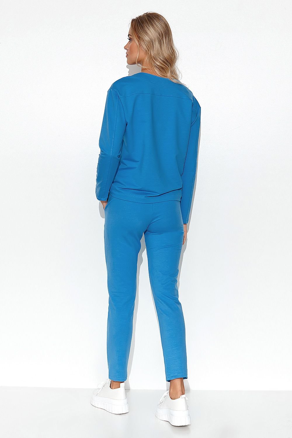 Elegant women's tracksuit set. The minimalist blouse has a deep v-neck, long sleeves and interesting modeling stitching. A delicate patch with the letter M was sewn on the front. The women's blouse looks extremely chic on the figure. Pants with a straight leg are its perfect complement. They also feature stitching, which gives the set a business chic look. On the sides, slip pockets are available. On the waist line, a thick elastic drawstring has been sewn into the pants. This makes the pants fit even better on a woman's figure.