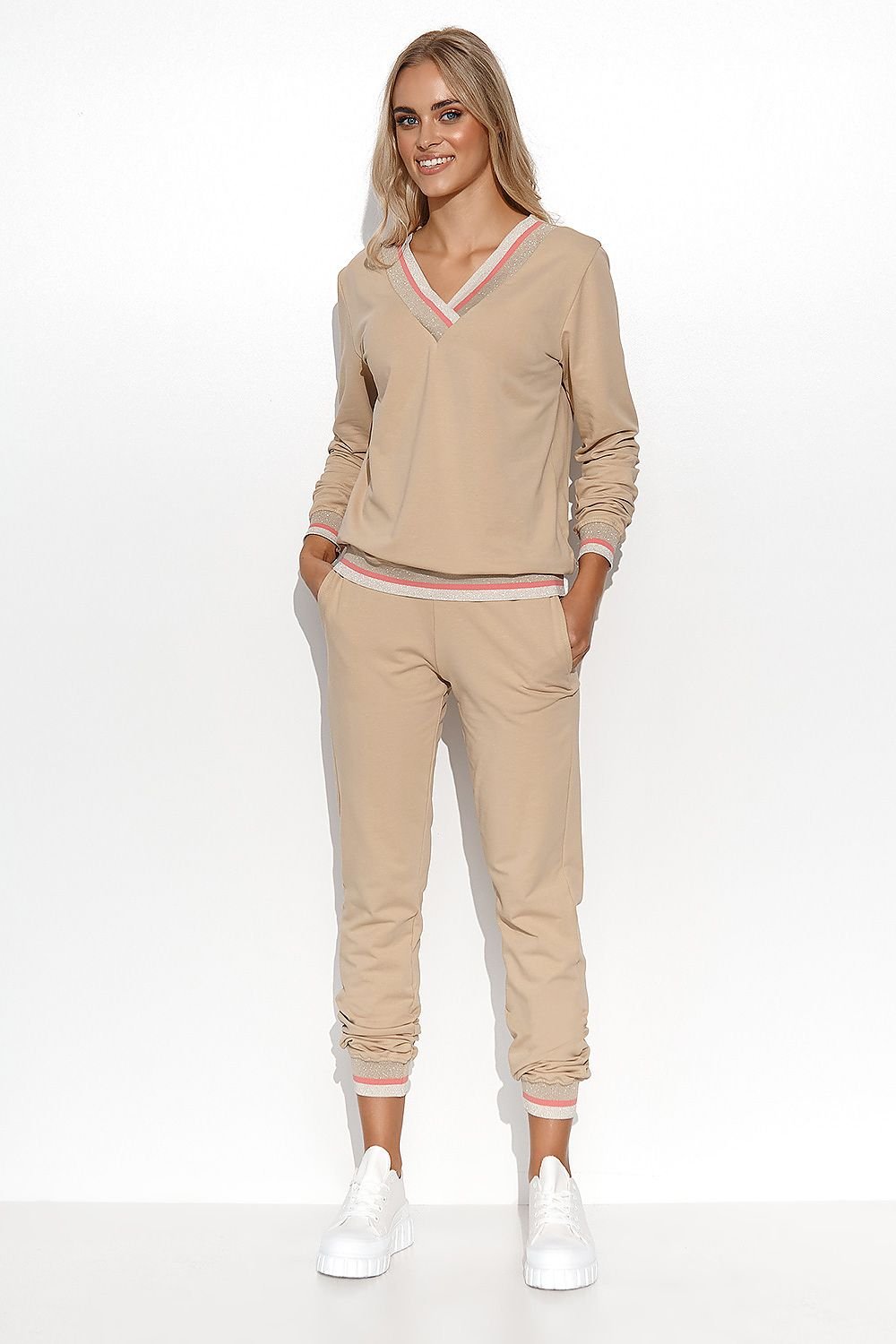 A lovely women's sweatshirt set, consisting of a sweatshirt tucked in over the head and classic long-legged pants. The women's sweatshirt is simple. It has long sleeves. The decorative element here is the striped welts present at the neckline, sleeves and lower part. The same element can be seen in the distal part of the legs of the women's pants. In addition, the pants have practical side slip pockets and a drawstring elastic located on the waist line. This is a set that you will wear on the occasion of a sports outing and for work. Everything is a matter of accessories.