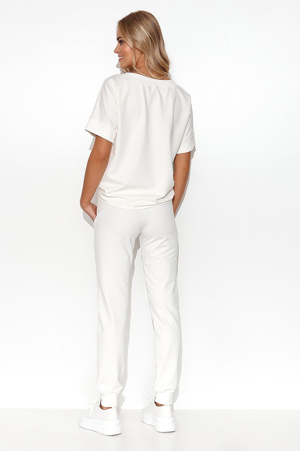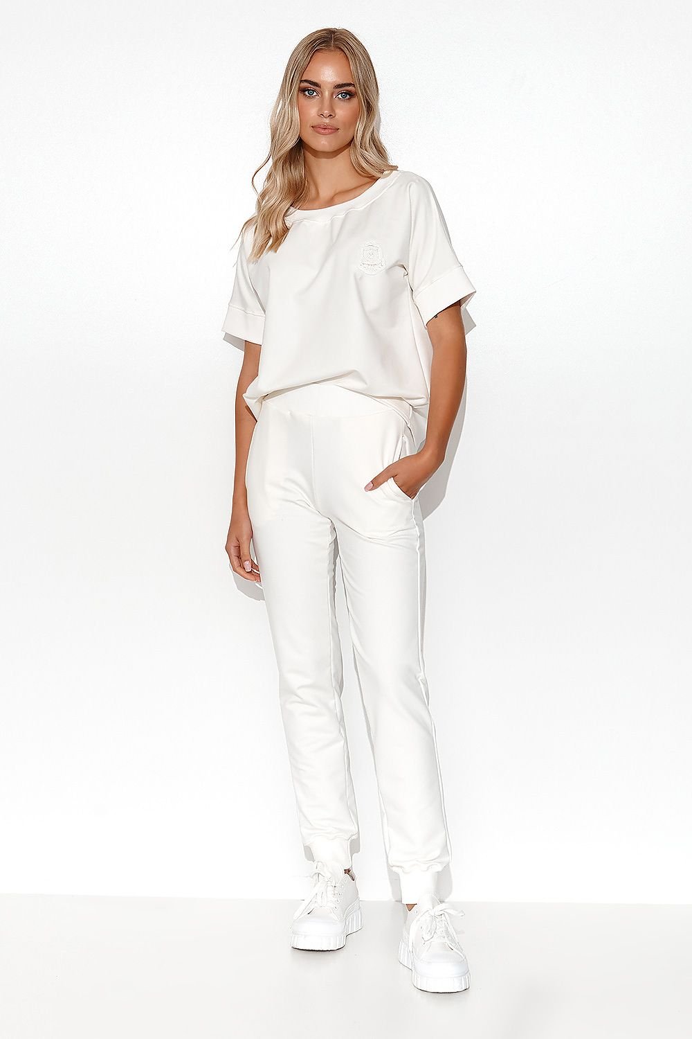 Lightweight women's tracksuit set. It consists of long pants with tapered legs and a loose-fitting women's blouse with short sleeves. The blouse has a generous round neckline decorated with the same trim as the sleeves, the distal part of the trouser legs and an elastic sewn on the waist line. This gives the set a sporty, casual touch. The blouse has a sweatshirt-colored patch on the front. Practical side slip pockets are present in the pants. This is a perfect set for a casual outing with friends or for work from home.