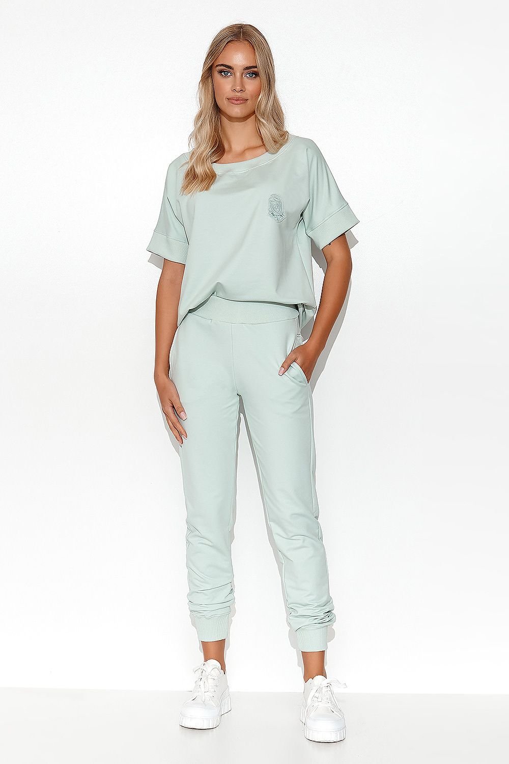 Lightweight women's tracksuit set. It consists of long pants with tapered legs and a loose-fitting women's blouse with short sleeves. The blouse has a generous round neckline decorated with the same trim as the sleeves, the distal part of the trouser legs and an elastic sewn on the waist line. This gives the set a sporty, casual touch. The blouse has a sweatshirt-colored patch on the front. Practical side slip pockets are present in the pants. This is a perfect set for a casual outing with friends or for work from home.