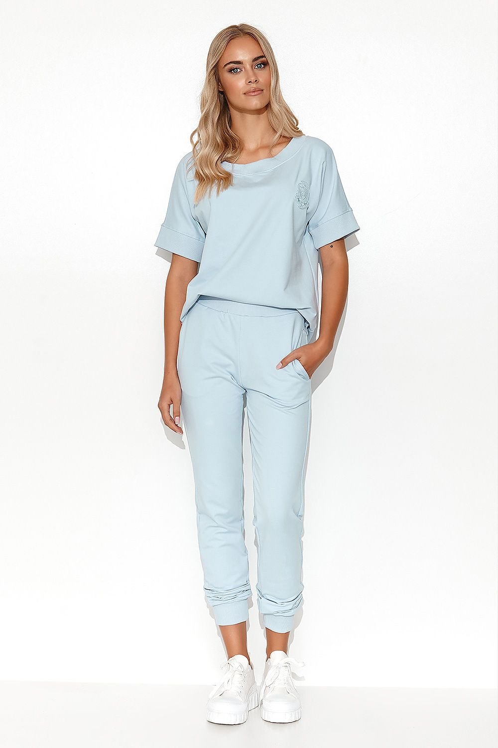 Lightweight women's tracksuit set. It consists of long pants with tapered legs and a loose-fitting women's blouse with short sleeves. The blouse has a generous round neckline decorated with the same trim as the sleeves, the distal part of the trouser legs and an elastic sewn on the waist line. This gives the set a sporty, casual touch. The blouse has a sweatshirt-colored patch on the front. Practical side slip pockets are present in the pants. This is a perfect set for a casual outing with friends or for work from home.
