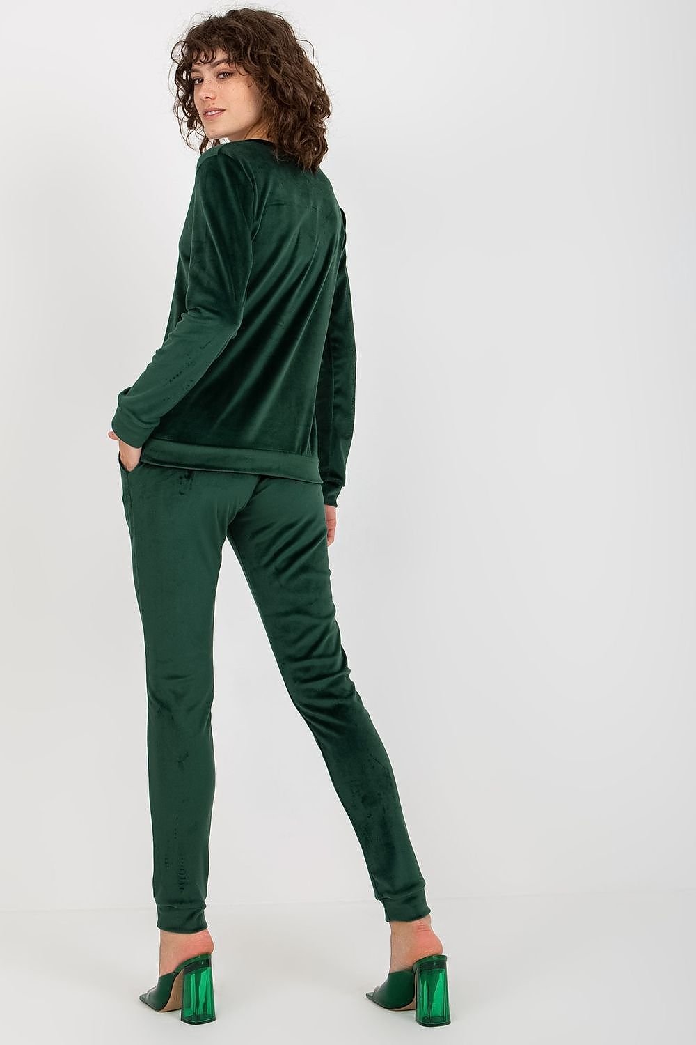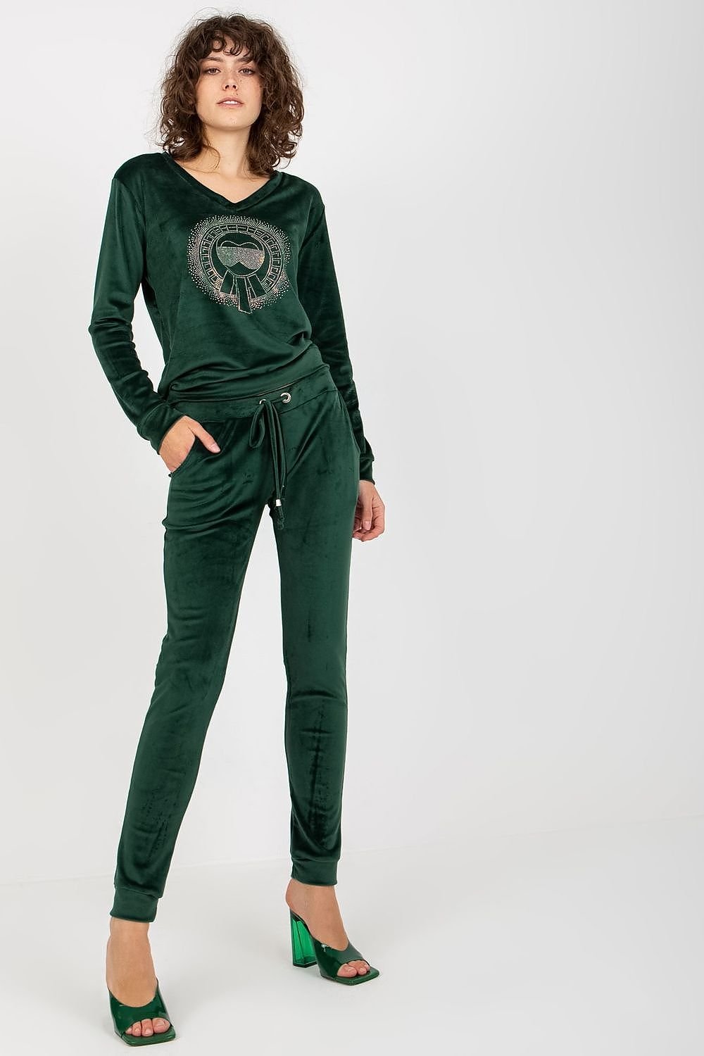 Velour set consisting of a blouse and pants. Blouse with long sleeves and a heart neckline. Long pants with a tie at the waist and slip pockets.
