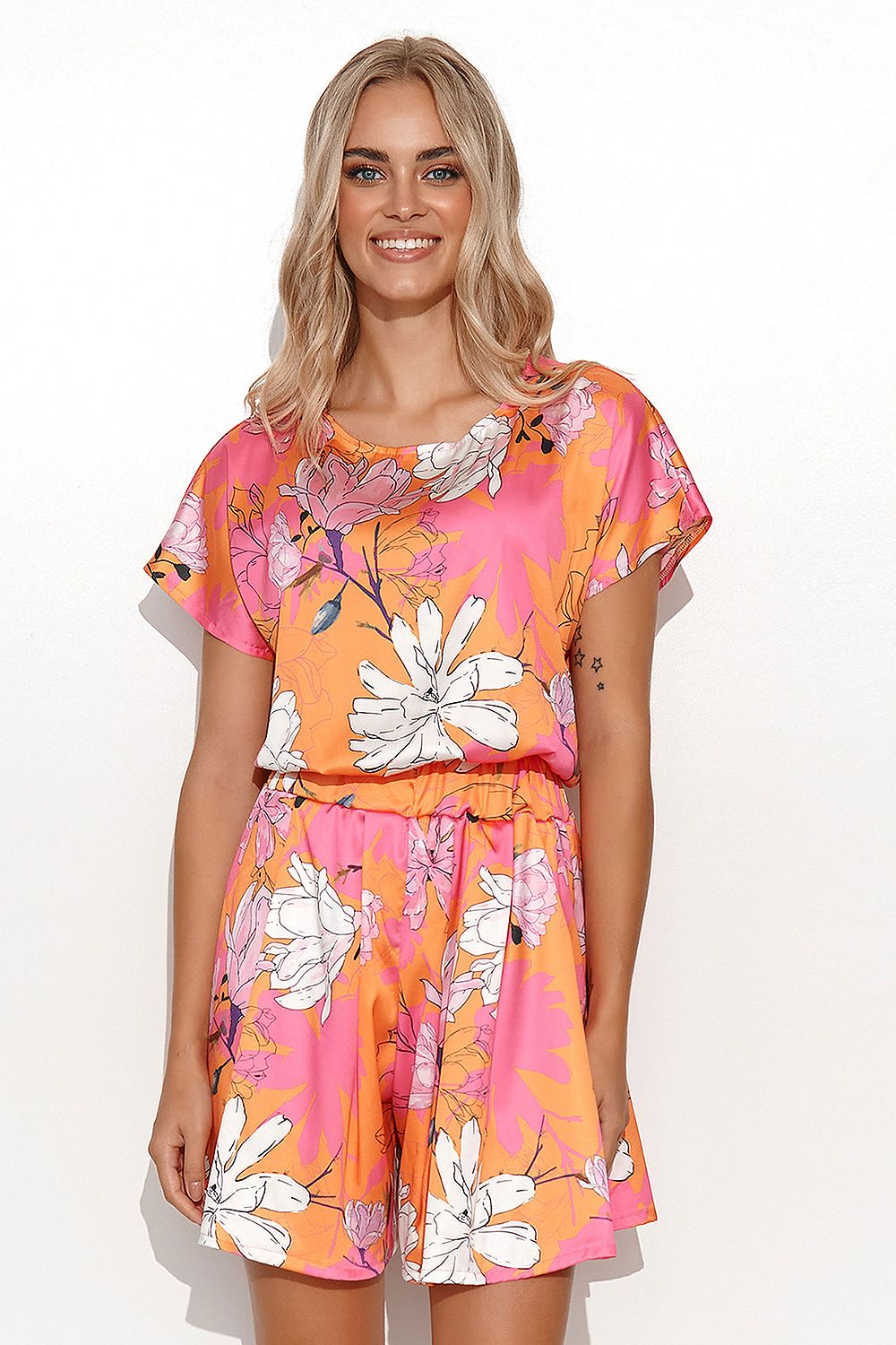 Extremely charming feminine summer set. The set consists of a short women's blouse and shorts made of satin fabric. The blouse has heavily cut short sleeves and a round neckline. It is quite short, so it will win the hearts of women who like to expose their belly in the summer. The set is accompanied by high-waisted shorts. Thanks to the thick elastic sewn on the waist line, they do not migrate during use. They are airy, perfect for hot days. For this set it is worth to wear shiny jewelry and elegant sandals. It is a perfect combination. The set comes in four variants, which differ in color and pattern.