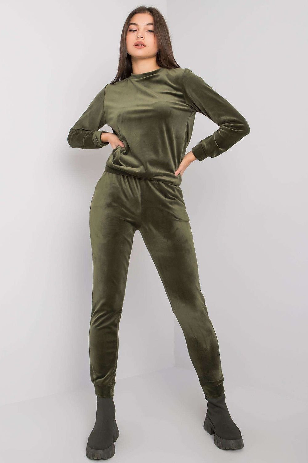 Ladies' velour set consisting of a blouse and pants. Blouse tucked in over the head, with long sleeves. Long pants with elastic waistband, slip pockets on the sides.