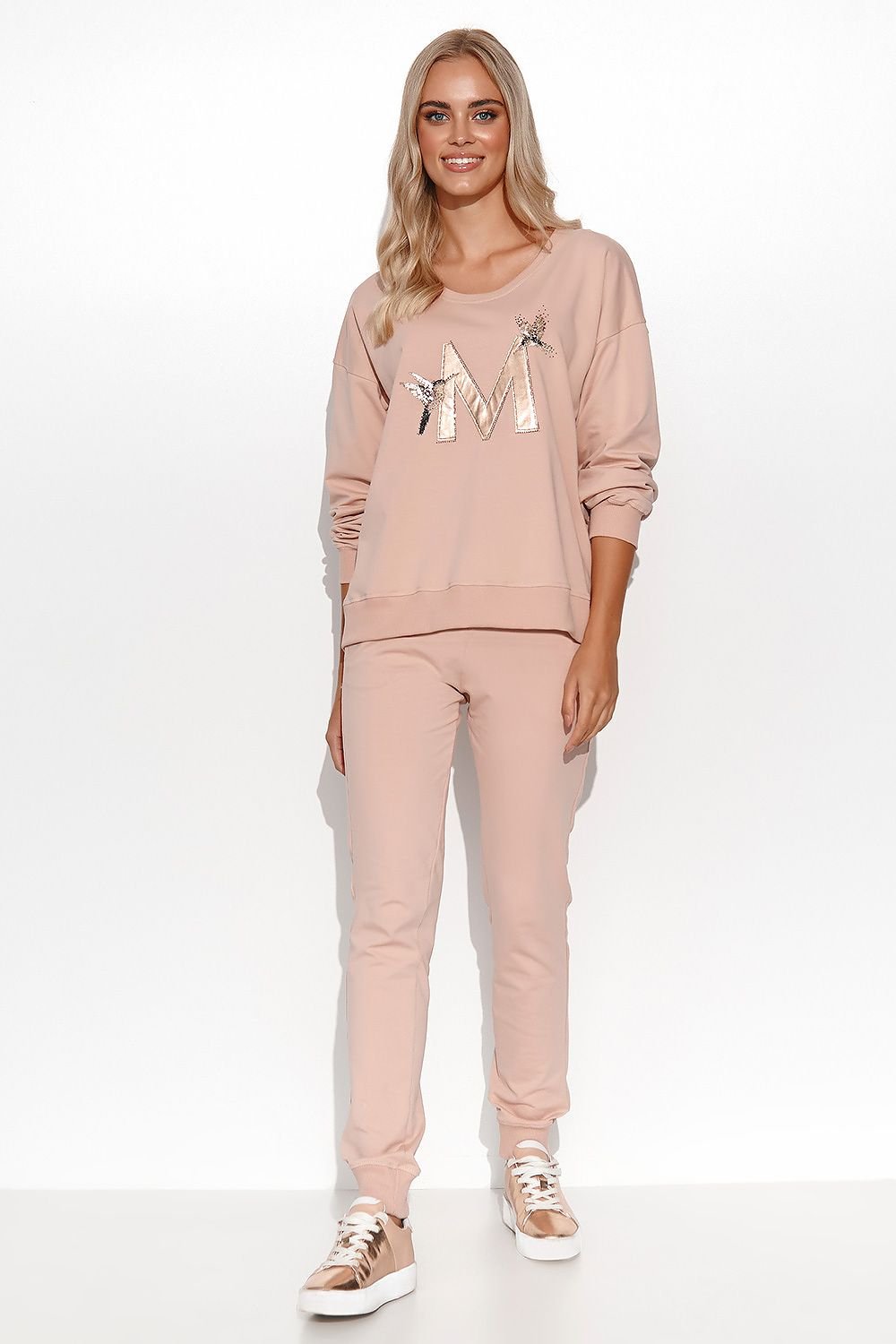 Cute women's sweatshirt set with a spring touch. The set consists of a sweatshirt tucked in over the head and long pants. The women's sweatshirt is casual. It has a classic straight cut and a rather deep round neckline. The back is plain and the front of the sweatshirt shows a decorative application with a bird motif. The women's sweatpants have straight legs finished with ribbed cuffs. They also have practical side pockets on the sides. The set is very comfortable and on the other hand elegant, so it can be worn both around the house and at work.